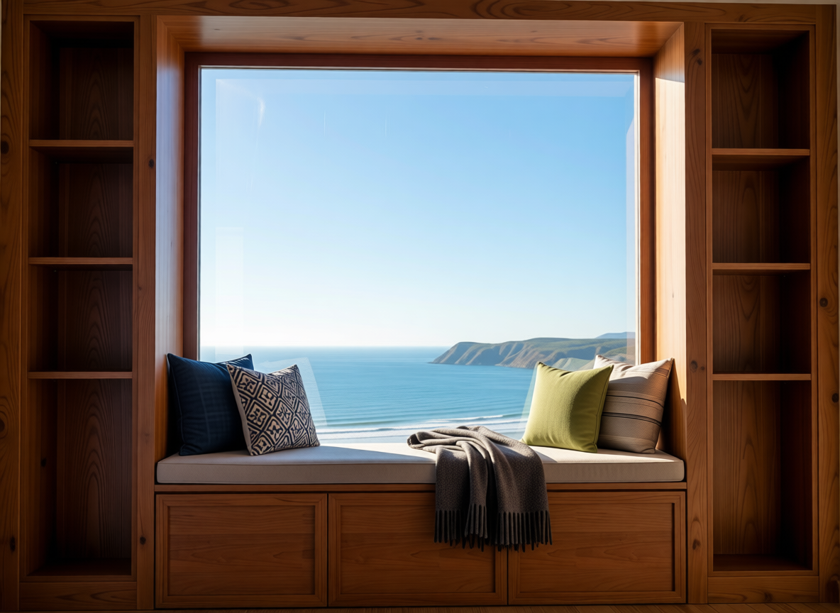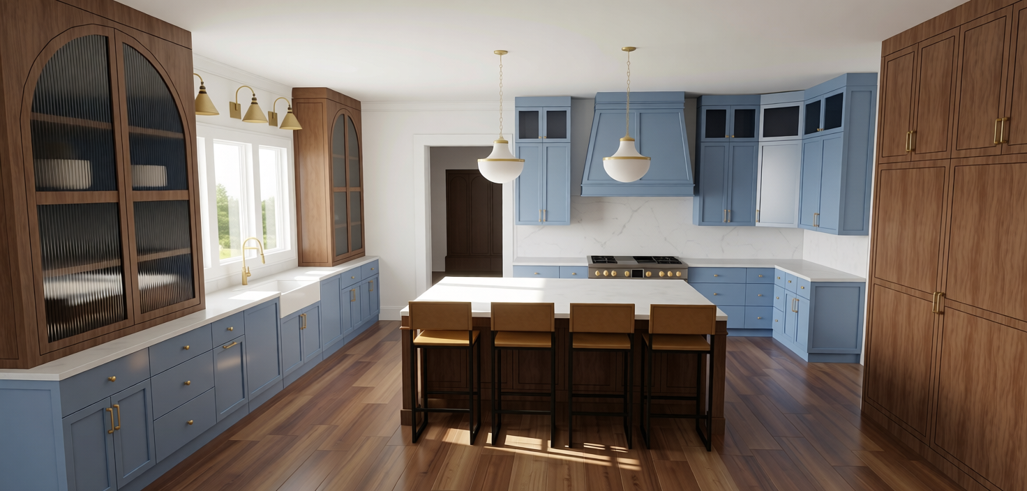 create an interior render with only natural light make the floor a medium light wood make the blue a rich moody teal blue