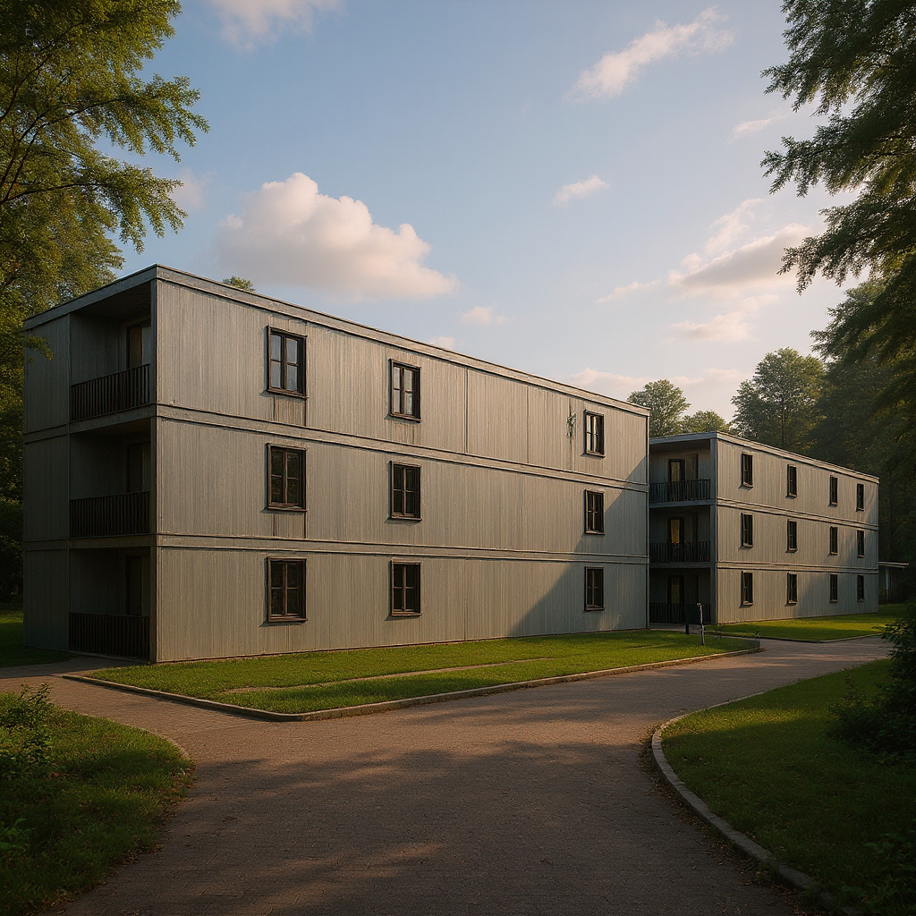 render this 6 storey multi family building in a modern farmhouse style keeping all existing geometry proportions and massing exactly as shown express the aesthetic purely through materiality tone and light use a composed farmhouse palette that balances warmth with scale off white or soft warm grey siding limited to select lower bays contrasted with deeper charcoal taupe or muted green vertical panels on alternating sections to create vertical colour separation and visual rhythm integrate natural wood accents around balconies soffits and entries for warmth and authenticity with dark bronze or black window frames and clean modern trim the base should be grounded with textured materials like stone veneer or dark brick for stability set the scene during sunset lighting warm golden light with long shadows glowing interiors visible through windows and subtle reflections on metal panels the lighting should enhance the tonal variation of materials and highlight the vertical rhythm and farmhouse textures surrounding landscape and hardscape should appear softly lit with gentle highlights on trees walkways and building edges evoking a welcoming community oriented modern farmhouse atmosphere at dusk