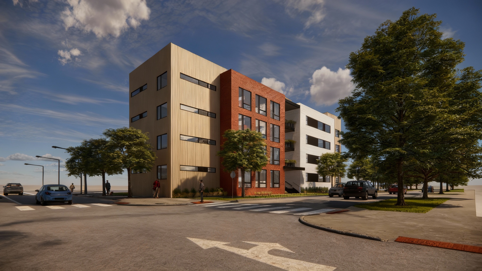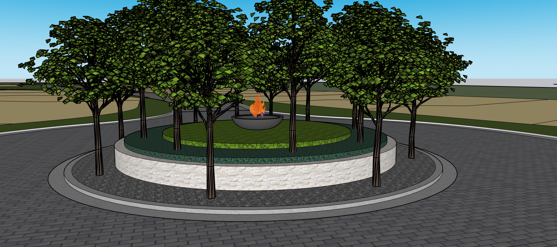 put an uplight under each tree and the landscape two tone make it also early afternoon