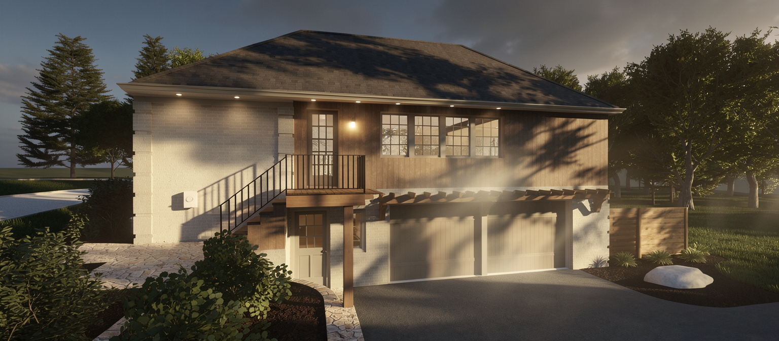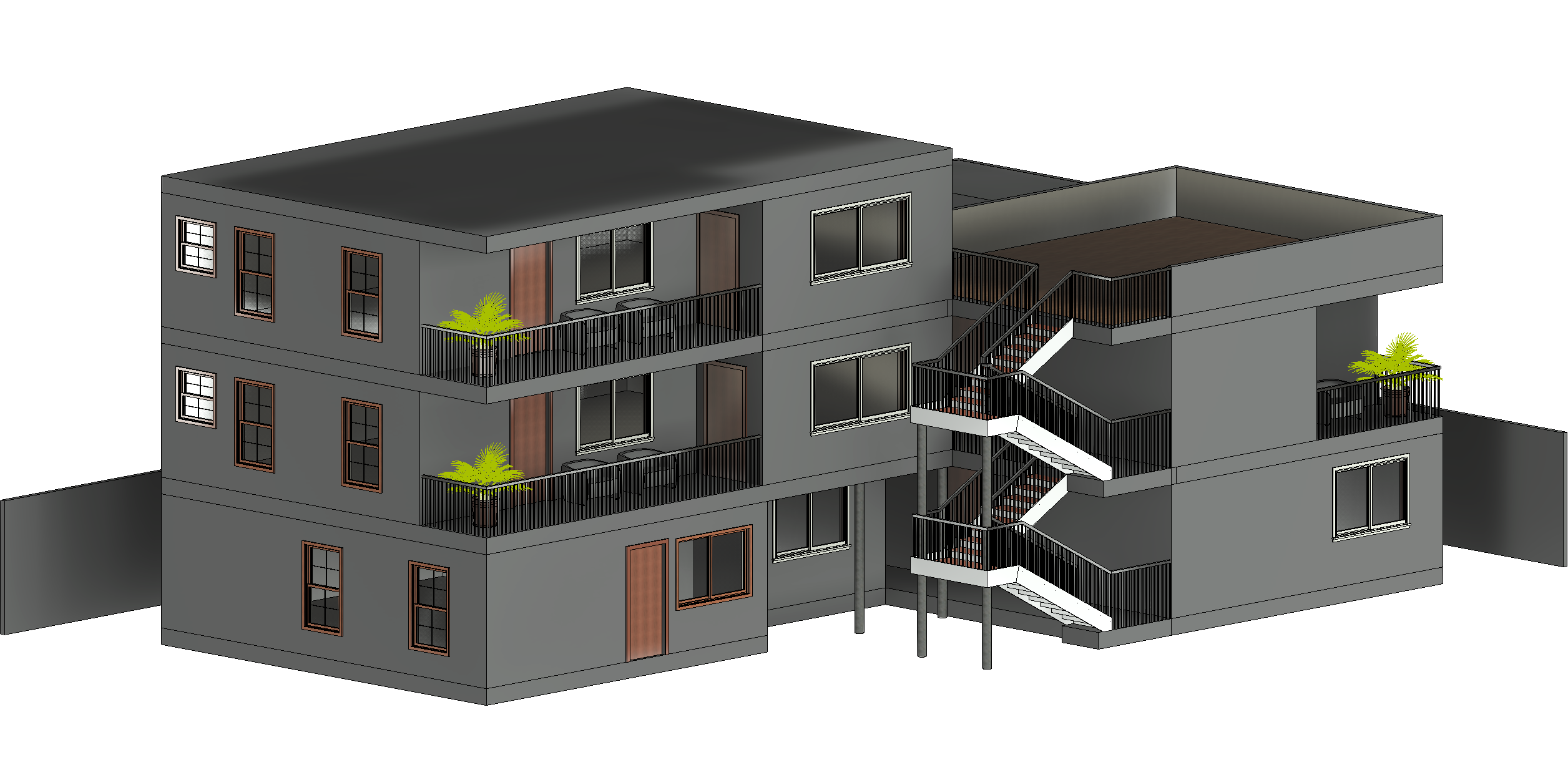 photorealistic outdoor of a new beige building with grass and modern plants tress and houses on the background warm tones add a concrete path on the grass