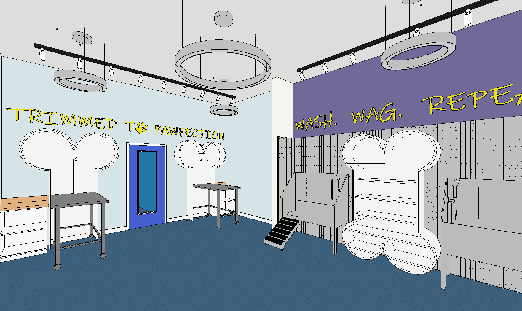 render this make the floor blue speckle vinyl the wall behind the dog washes is a ribbed concrete wall panel add towels to the bone shelf between the dog washes add depth to the yellow slogans right wall purple right wall pale blue