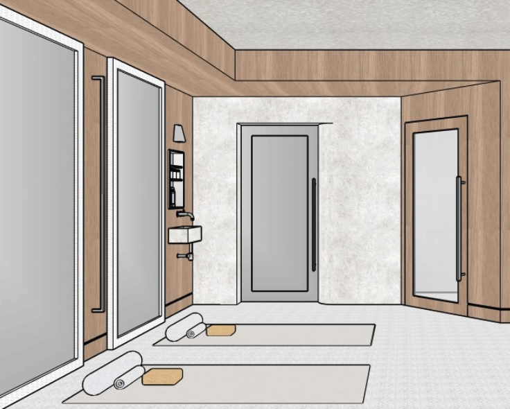 this is a home gym with framed mirrors on the left the center feature wall is in plaster and has a stainless steel door the flooring is a beige chilewich floor mat wood walls are clear alder