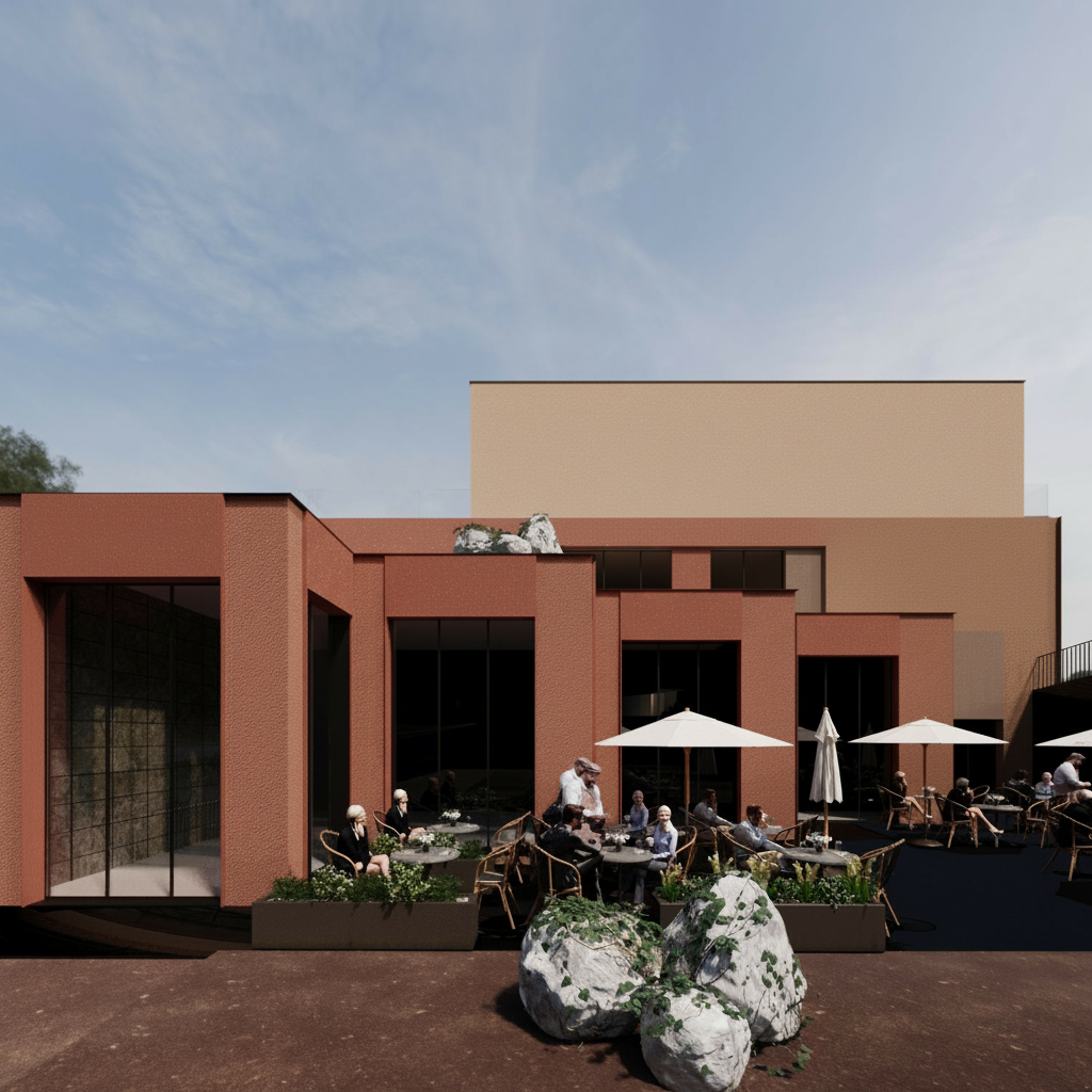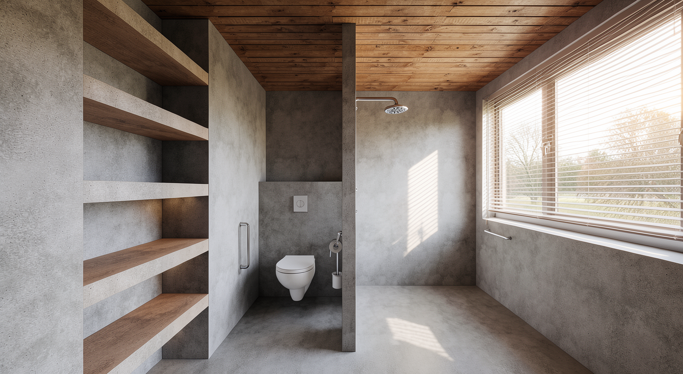 transform this raw 3d model into a highly photorealistic interior render while strictly preserving the exact proportions geometry and layout of the original model no changes in dimensions or design the space is a luxury bathroom located on the first floor materials finishes all floors walls and built in elements finished in seamless light beige mortex microcement soft matte texture high end and perfectly continuous without visible joints ceiling finished with refined sauna wooden planks warm tone natural grain subtle variation perfectly aligned shelves are also seamless mortex in the same light beige finish no joints no led strips integrated sanitary fixtures faucet and shower brushed stainless steel rvs premium quality realistic reflections styling add a few neatly folded towels on the shelves in neutral tones beige soft earth colors styled minimally lighting ultra realistic lighting setup soft indirect natural daylight entering through the window balanced artificial lighting with subtle shadows and realistic light falloff no visible led strips in shelves windows exterior window coverings mostly closed semi opaque allowing soft filtered daylight exterior view slightly blurred and out of focus since it is on the first floor the outside should feel elevated and realistic no buildings visible outside only sky and some trees rendering style high end architectural visualization ultra photorealistic materials textures and reflections soft depth of field realistic shadows and natural imperfections clean calm minimal luxury aesthetic