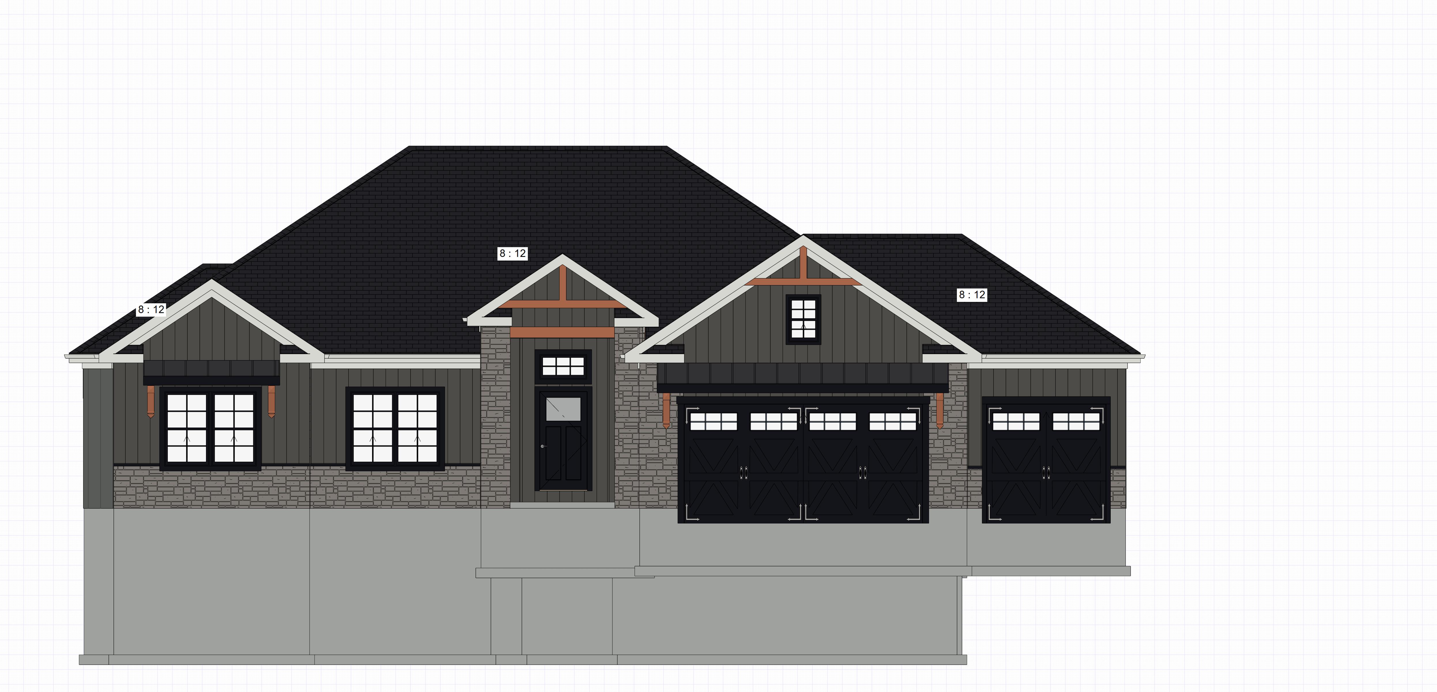 create a full color photorealistic rendering of this home elevation include driveway and landscaping the home is on large rural lot so there will not be homes close by next door there is a basment so the gray area at the bottom of the source photo is underground use a modern gray color scheme with board and batton siding the window sashes are black