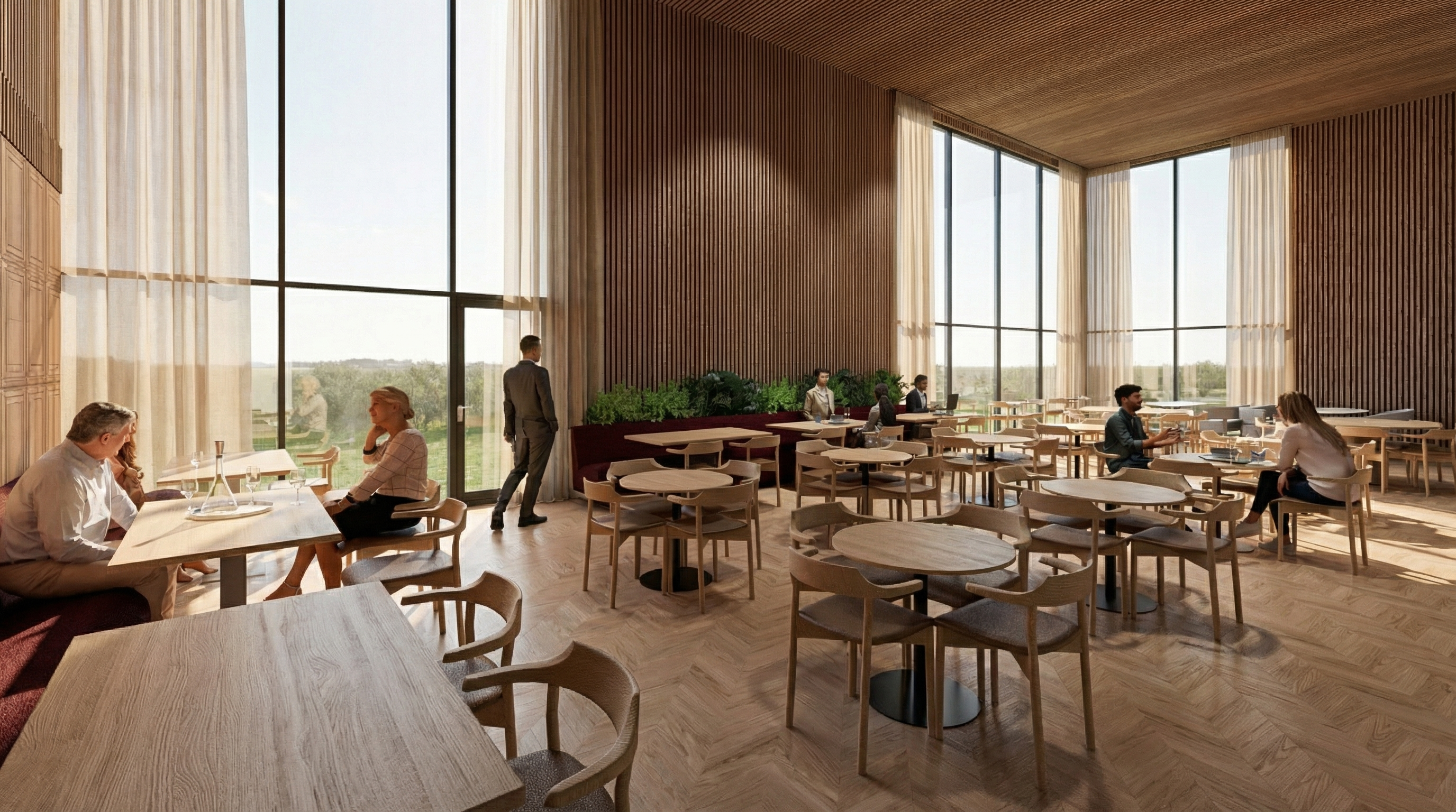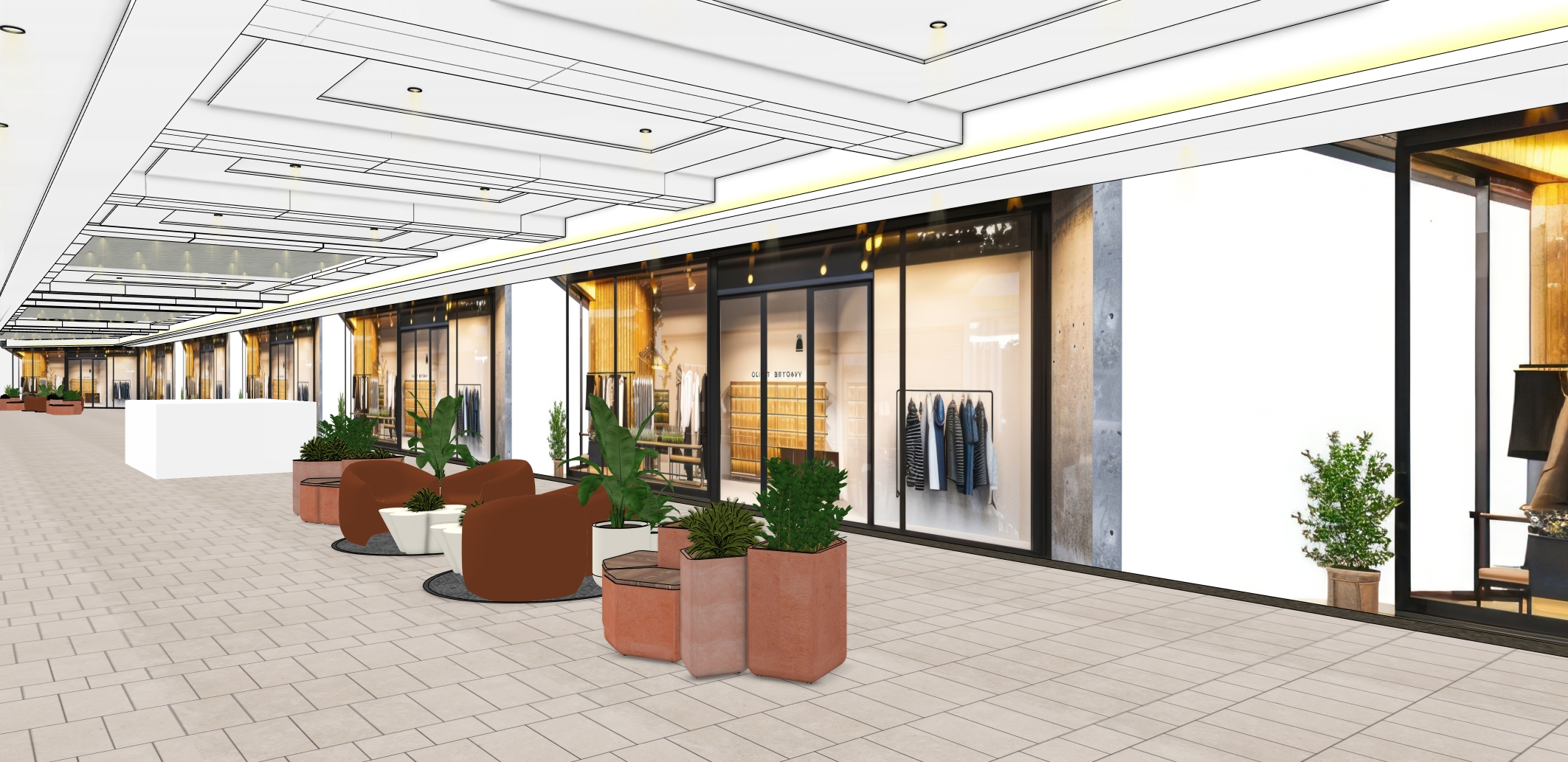 stylish modern indoor shopping centre with a sleek design and a luxurious atmosphere satin finish tile floors in soft beige tone storefronts feature large framed glass windows showcasing elegant displays overall the ceiling should remain white ambient lighting cast a warm golden glow keep the material color finishes texture and shape add lush green potted plants in textured terracotta pots enhancing the inviting and sophisticated mood it s rendering add shopping people in the rendering