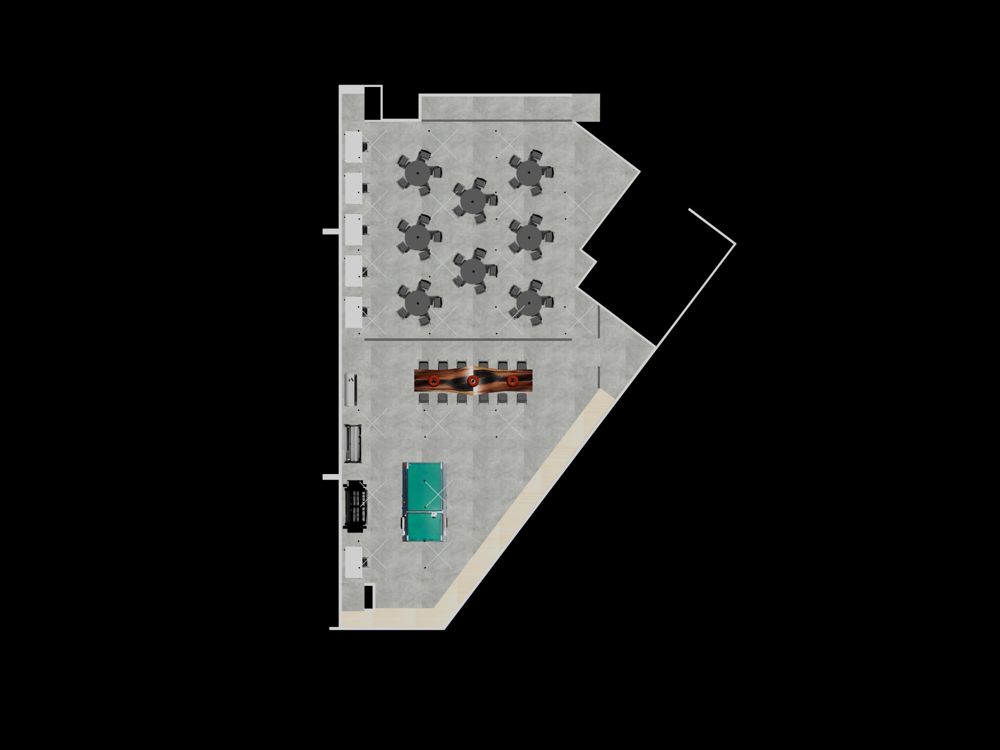hyper realistic orthographic top down architectural render of a contemporary classroom learning space captured in a true orthographic projection with no perspective distortion precise scale accuracy and crisp plan view clarity the floor is finished in light grey polished concrete showing subtle tonal variation fine aggregate texture and realistic surface imperfections visible from above the classroom footprint follows an irregular geometry with angled perimeter walls and clean sharply defined edges the primary learning area contains multiple round black tablet desks arranged evenly for collaborative seating each table is surrounded by ergonomic classroom chairs featuring black seat upholstery and dark grey powder coated metal frames clearly legible in plan view with accurate spacing orientation and circulation clearances a central collaborative zone includes a long communal wood worktable with visible natural wood grain and darker edge detailing supported by black metal legs above the table matte maroon industrial pendant lights are visible in plan as evenly spaced circular fixtures aligned along the table s longitudinal axis the production area includes a large format plot cutter positioned along the perimeter wall and clearly readable from the orthographic top view with correct scale and orientation a recreational or activity zone features a table tennis activity table centered within its designated area and aligned with surrounding circulation paths structural column beams are clearly represented in plan view as rectangular and linear elements integrated into the architectural layout the beams align with the ceiling structure and column grid maintaining consistent thickness spacing and alignment and are rendered with accurate material tone and clean edges reinforcing the structural logic of the space ceiling elements visible in plan include linear led light strips arranged in an angular dynamic pattern emitting cool neutral light at 4000k evenly distributed across the space walls are light toned and minimal providing contrast against darker furniture and ceiling elements circulation routes remain unobstructed and clearly readable in plan lighting is physically accurate with global illumination calculated for a top down view subtle shadowing directly beneath furniture and structural elements realistic ambient occlusion and true to scale proportions ultra high resolution photorealistic pbr materials sharp linework neutral color grading architectural visualization quality orthographic top view no perspective no stylization no color or material changes