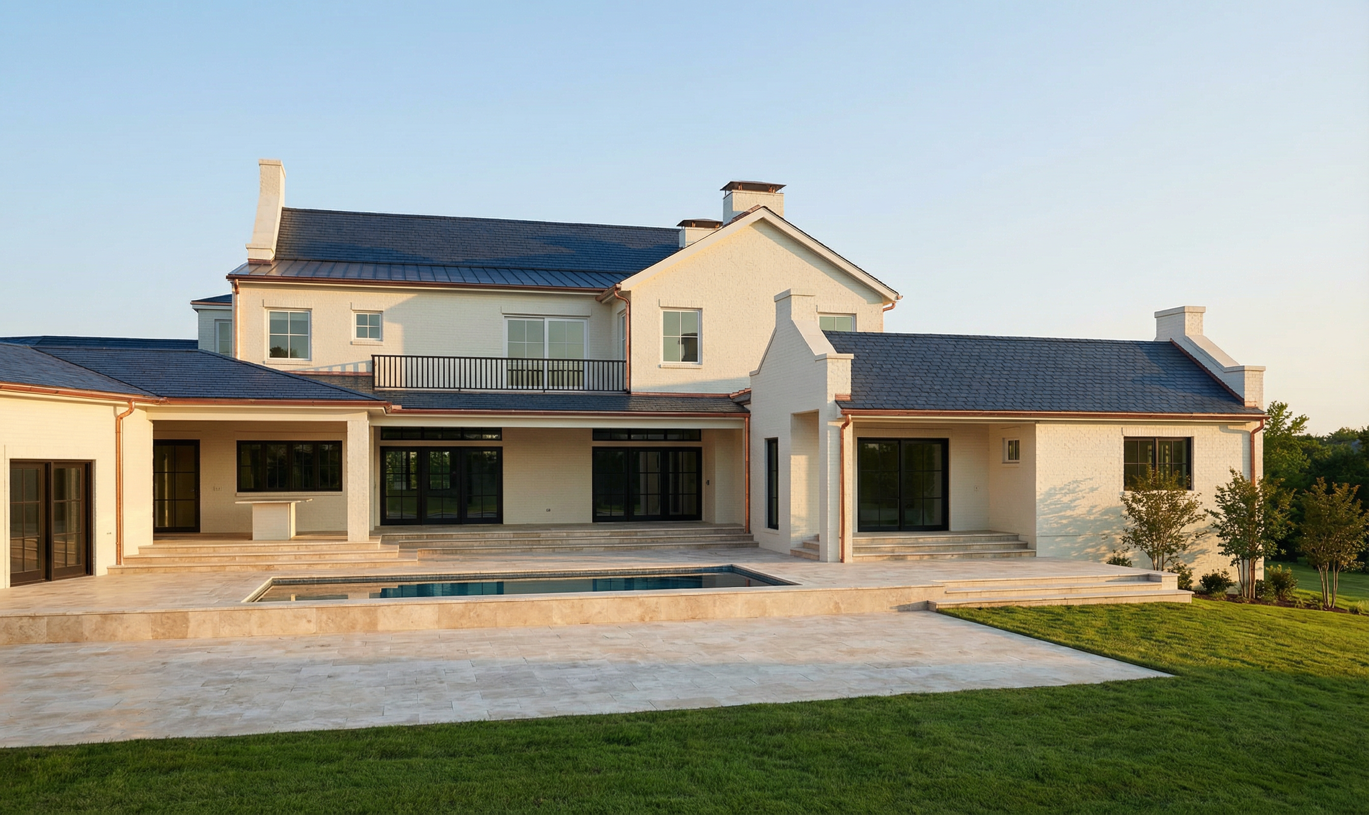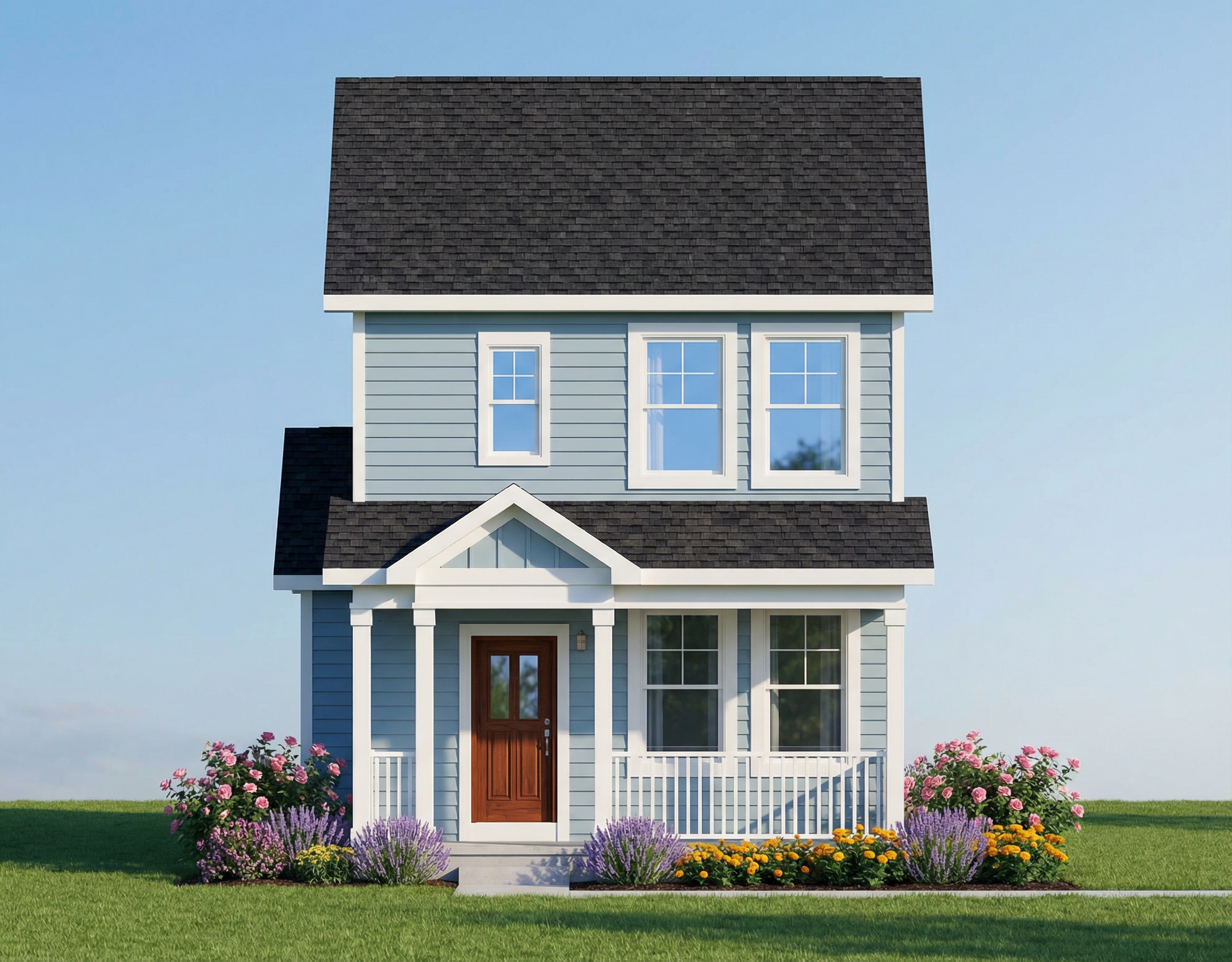 add a few clouds to the sky more landscaping w large tree in foreground add cottage style shutters to window over door