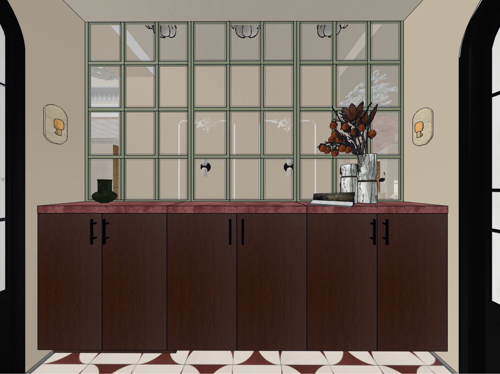 all lights visible through the window turned on all wall sconces turned on sharp and crisp image quality high clarity well defined edges photorealistic sharpness