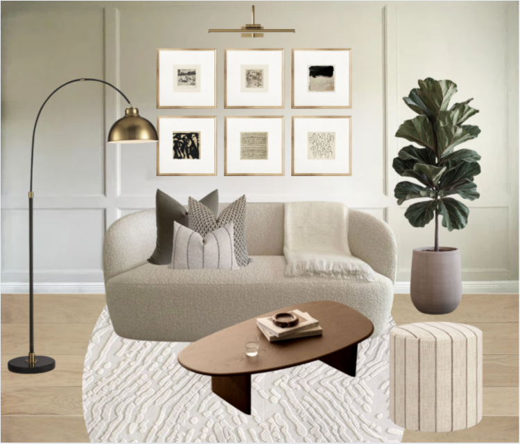 perspective shot a cozy and elegant modern living room with soft neutral tones a light beige textured sofa with gray and patterned throw pillows paired with a creamy plush throw blanket a dark wood oval coffee table sits atop a textured white rug with a subtle geometric pattern a striped beige ottoman complements the scene on the wall a series of six black and white minimalist art pieces in gold frames provide a sophisticated backdrop a tall arching floor lamp with a brass finish illuminates the area to the right a large lush green fiddle leaf fig plant in a matte taupe pot adds a touch of nature the setting exudes a warm contemporary atmosphere with subtle artistic touches