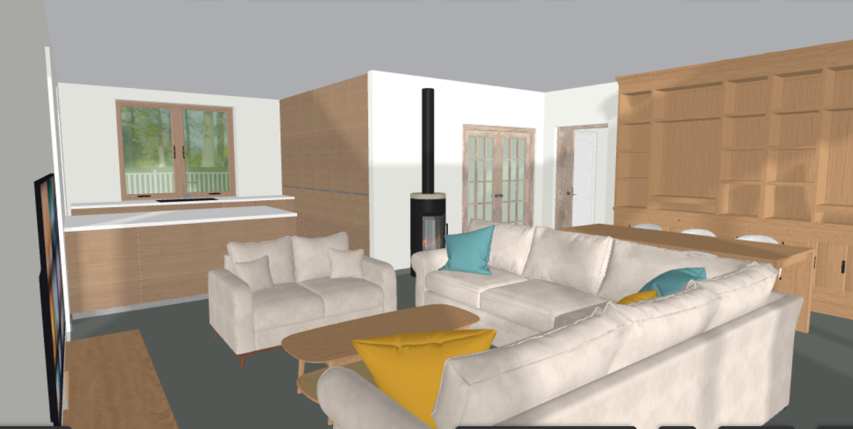 keep all elements as they are the sizes and placements and more or less the colors too just make it look realistic kitchen warmer oak veneer white countertop the other furniture also in warmer oak veneer dining table in solid wood
