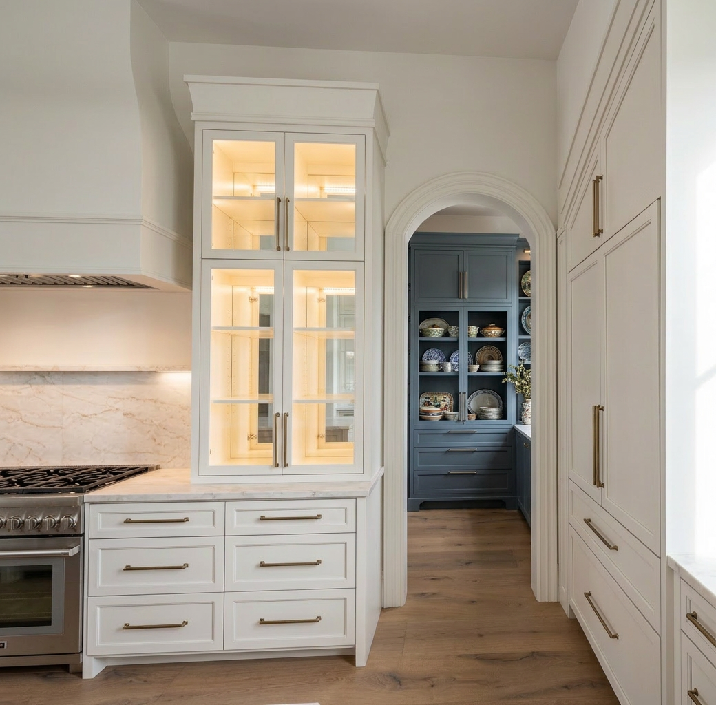 make white cabinet with glass have dishes inside of it add glass and style the top cabinets on the blue cabinet