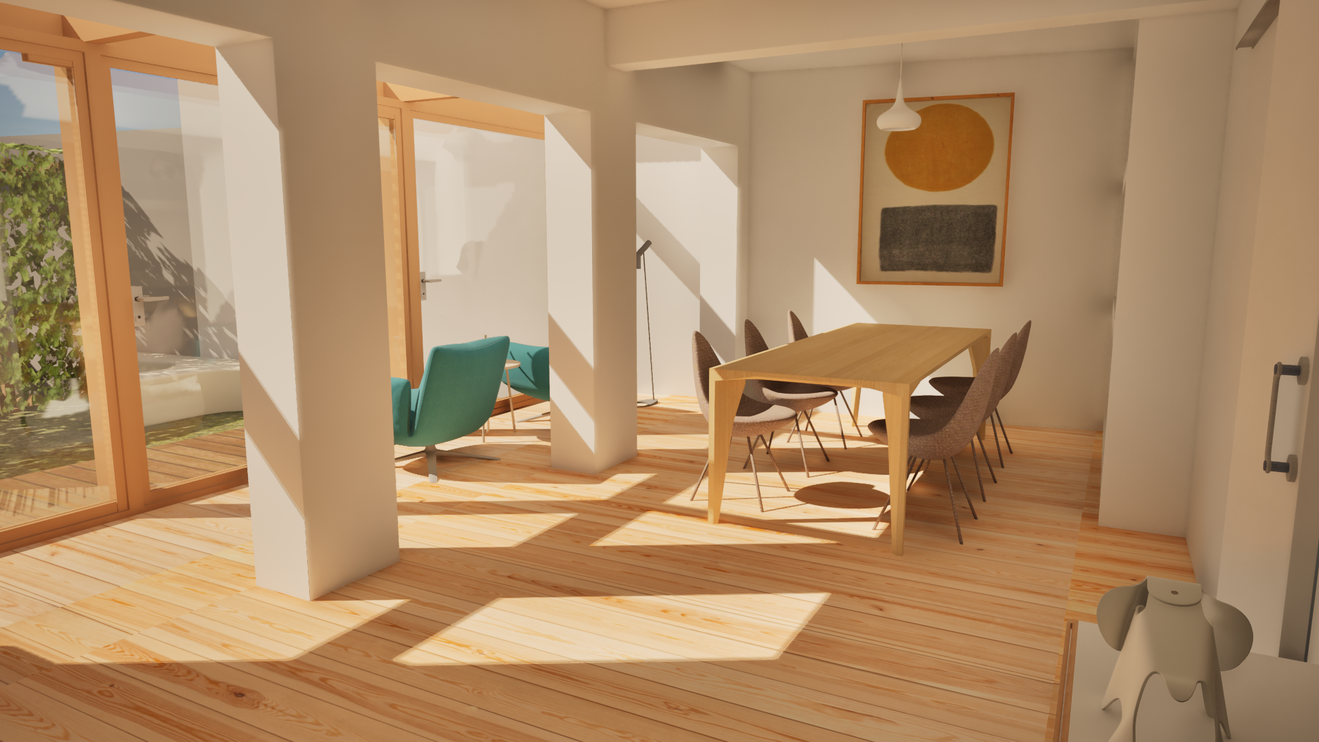 natural sunlight cascading down the walls grazing sunlight effect long dramatic shadows afternoon sun position warm natural light washing over walls rhythmic shadows from architectural elements global illumination 8k architectural photography sharp details