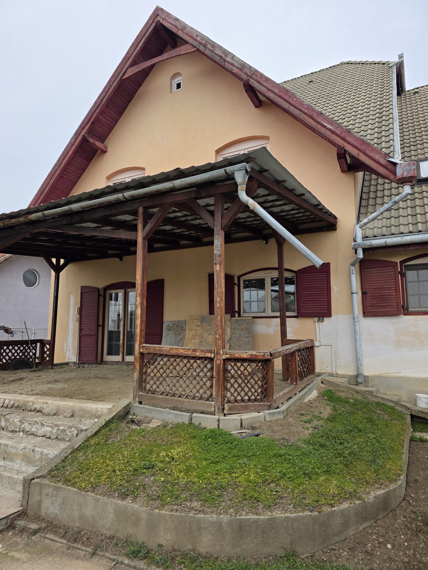 renovate and make everything new using the reference image strighten the wood and make beautyful wooden terace remove stones from the terace between the door and windows dark window and door frames