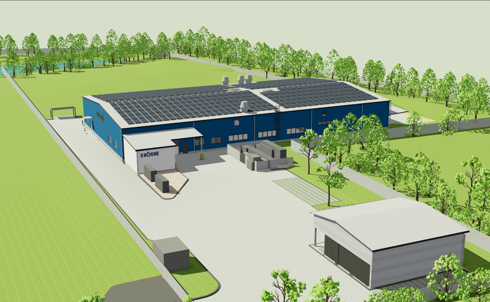 modernist exterior shot superb architectural aerial view industrial building embedded in greenery trees trees and field in background architecture