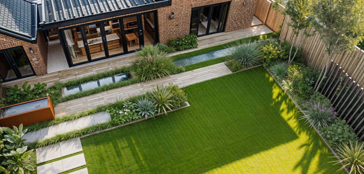 keep image as the same but add another multi stem silver birch tree near the house in the far corner of the garden in line with the other two trees