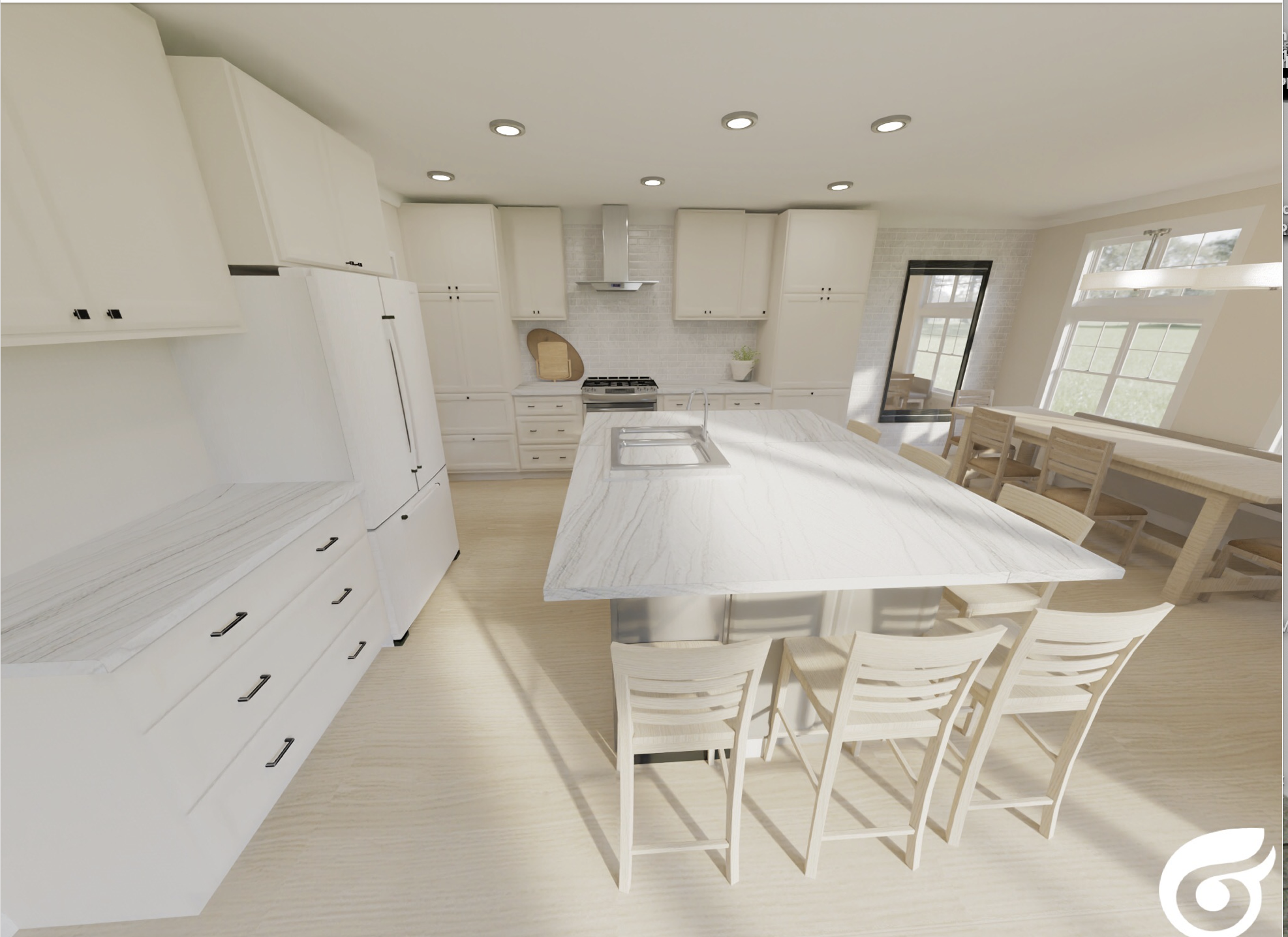 this stunning new kitchen is outfitted with warm white cabinets and a warm grey island the medium toned oak floors complement the veining in the quartzite countertops white subway tiles on all the backsplashes are highlighted by undercabinet lighting from the upper cabinets the soft white paint on the walls and trim act as a perfect backdrop for the custom cabinetry