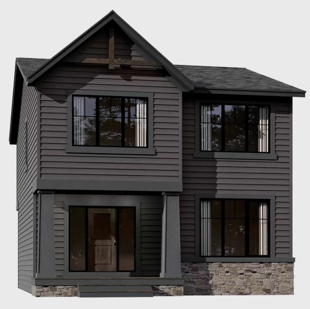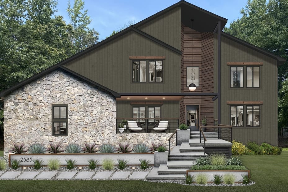 exterior shot change the exterior wall color trim and stone referencing to the moodboard