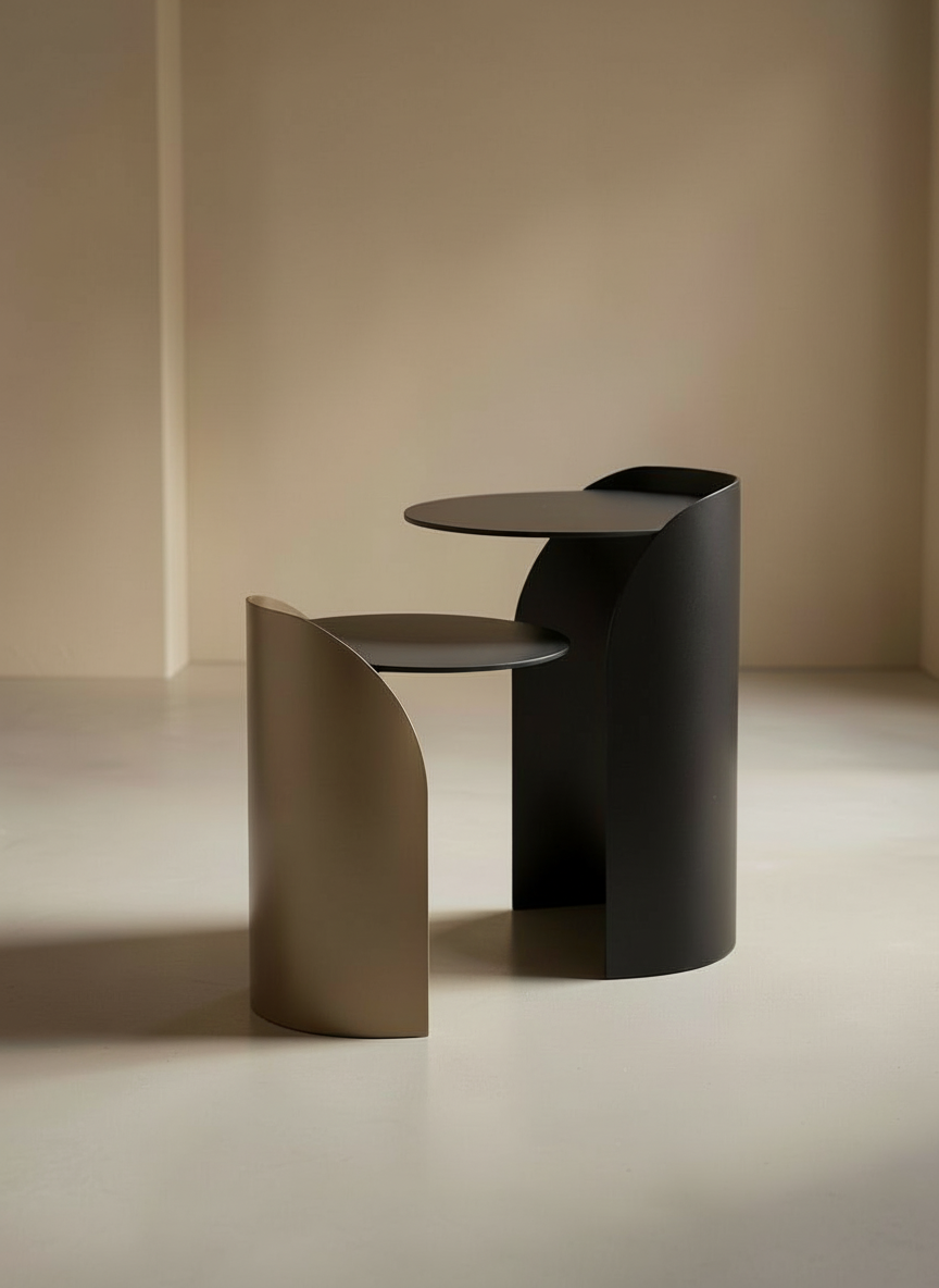 the table is placed beside a minimalist sofa in a calm living space balanced composition warm neutral tones soft daylight