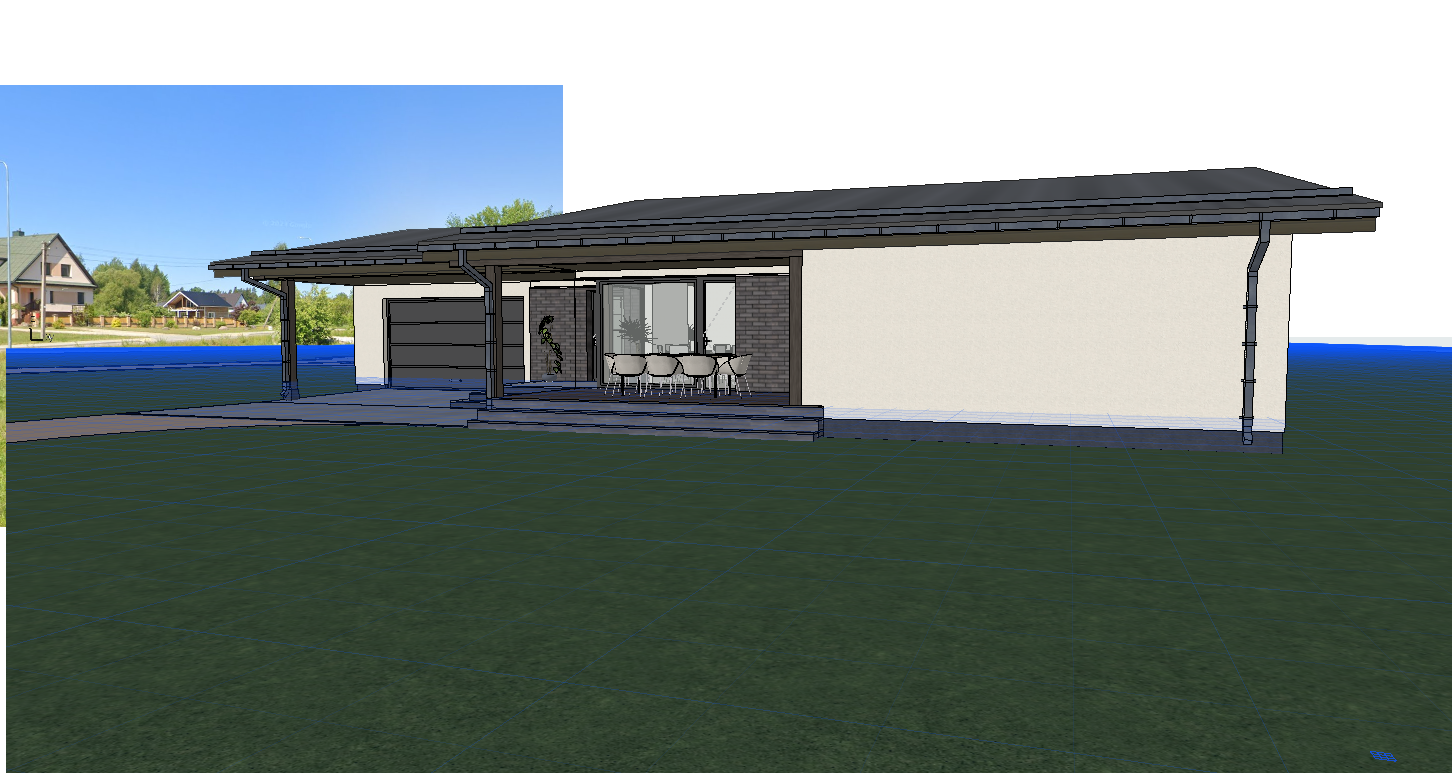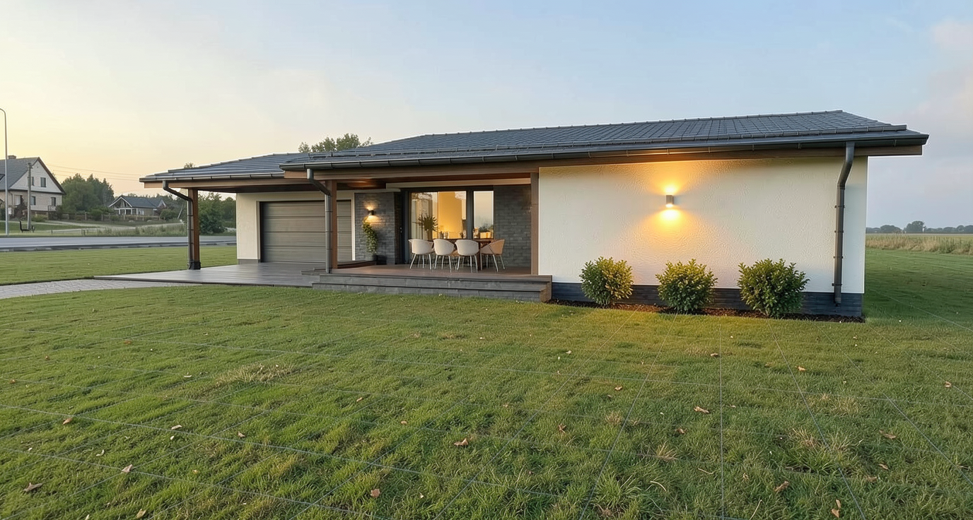 the facades are light plaster and dark gray clinker there are three small bushes by the wall and there is a light on the wall remove the grass from the lawn