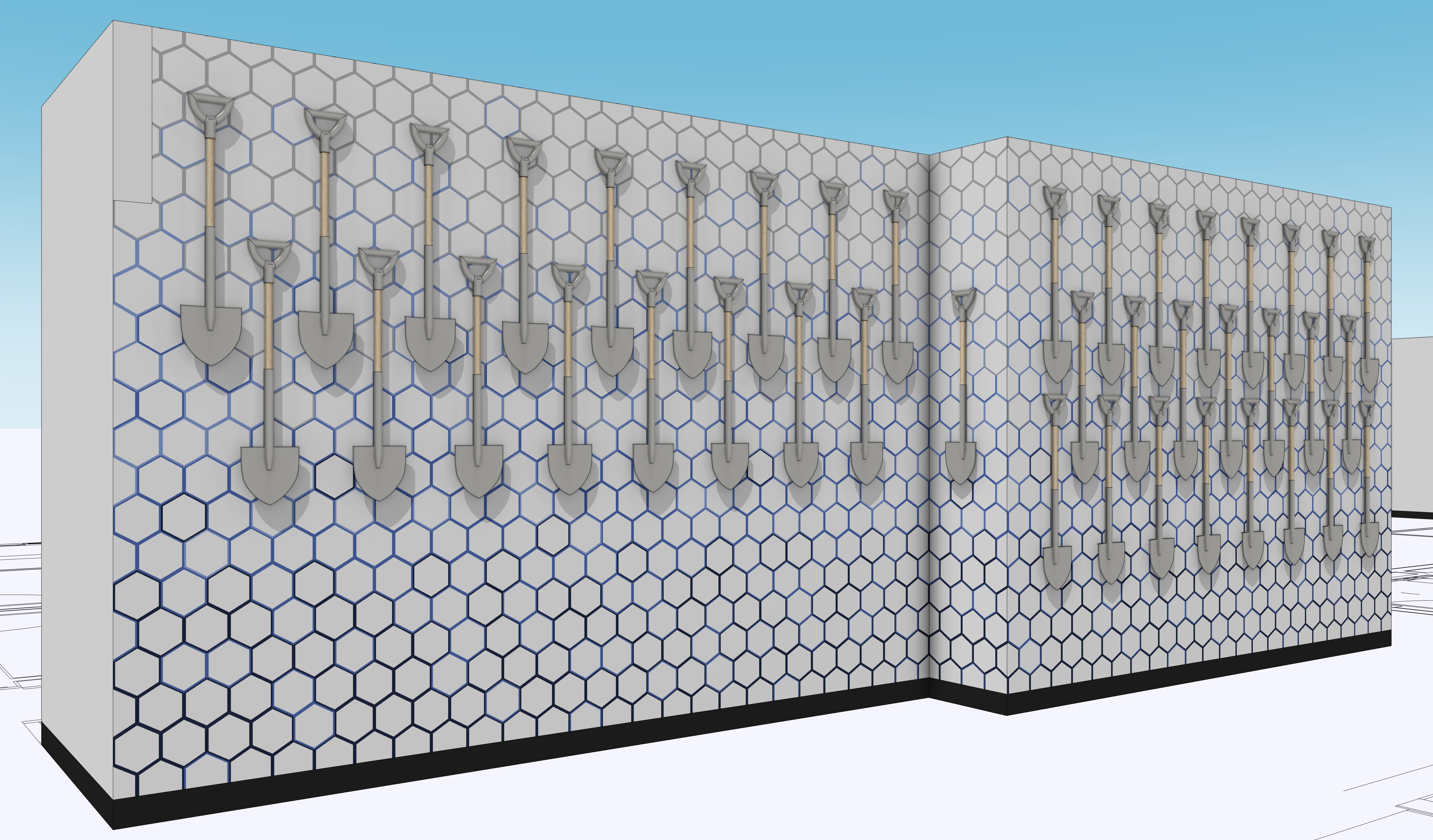 render a modern wall with a pattern of gray shovels aligned vertically the background consists of white hexagonal tiles outlined in a gradient from deep blue to black creating a geometric pattern the shovels are metallic gray with light tan wooden handles the scene is set under a clear sky with a soft gradient from light blue at the top to white at the horizon the atmosphere is clean and minimalist highlighting the contrast of the geometric shapes and neutral colors