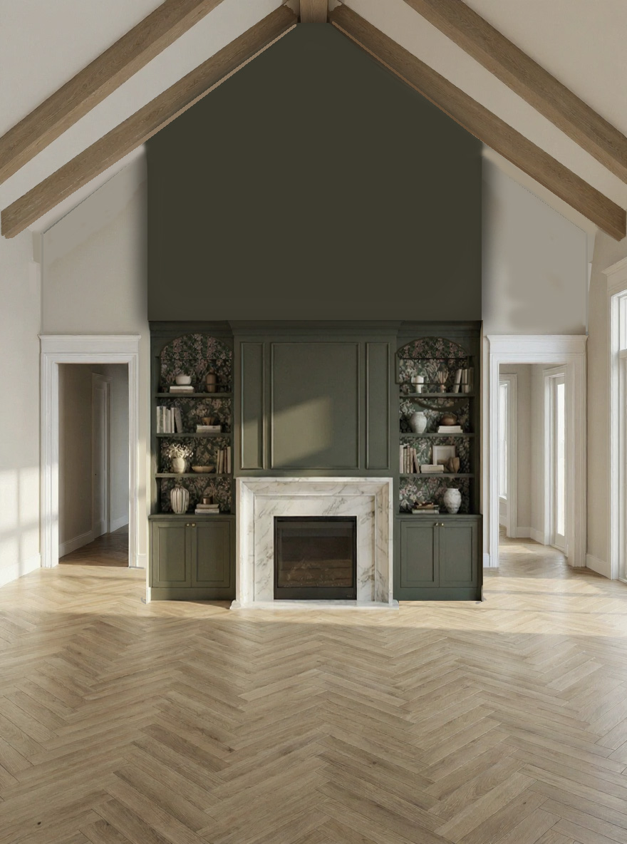 living room fireplace with marble mantel on extended wall all of the green wall is at the same depth wood flooring in white oak finish change to horizontal wood flooring pattern lots of natural light coming through the windows and doors