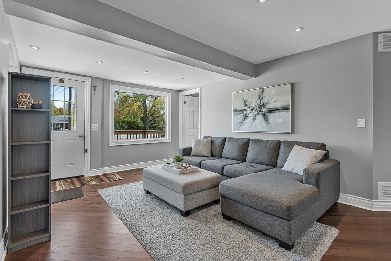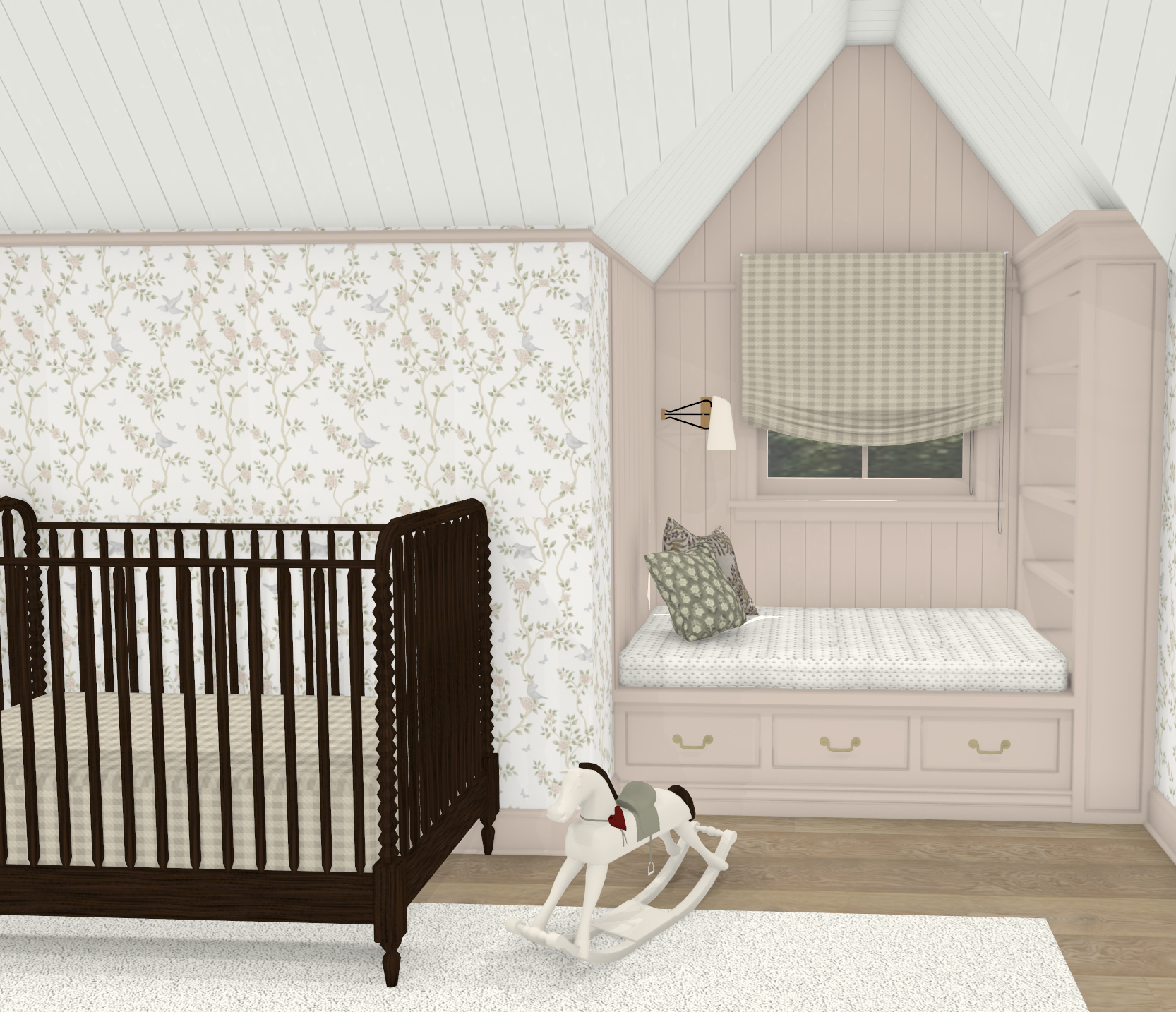 render this image as photo realism please maintain all exact colors and details but change the vertical paneling on the walls and ceiling to a light peach color