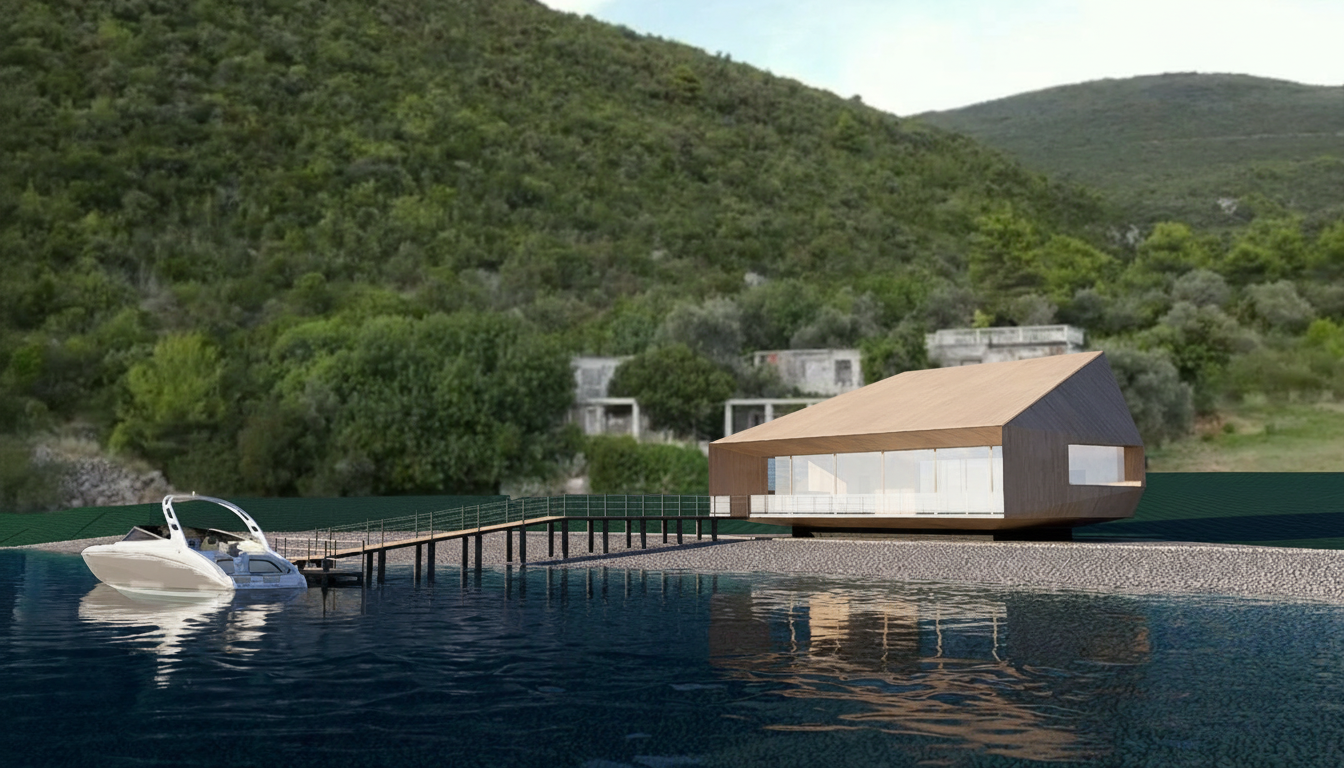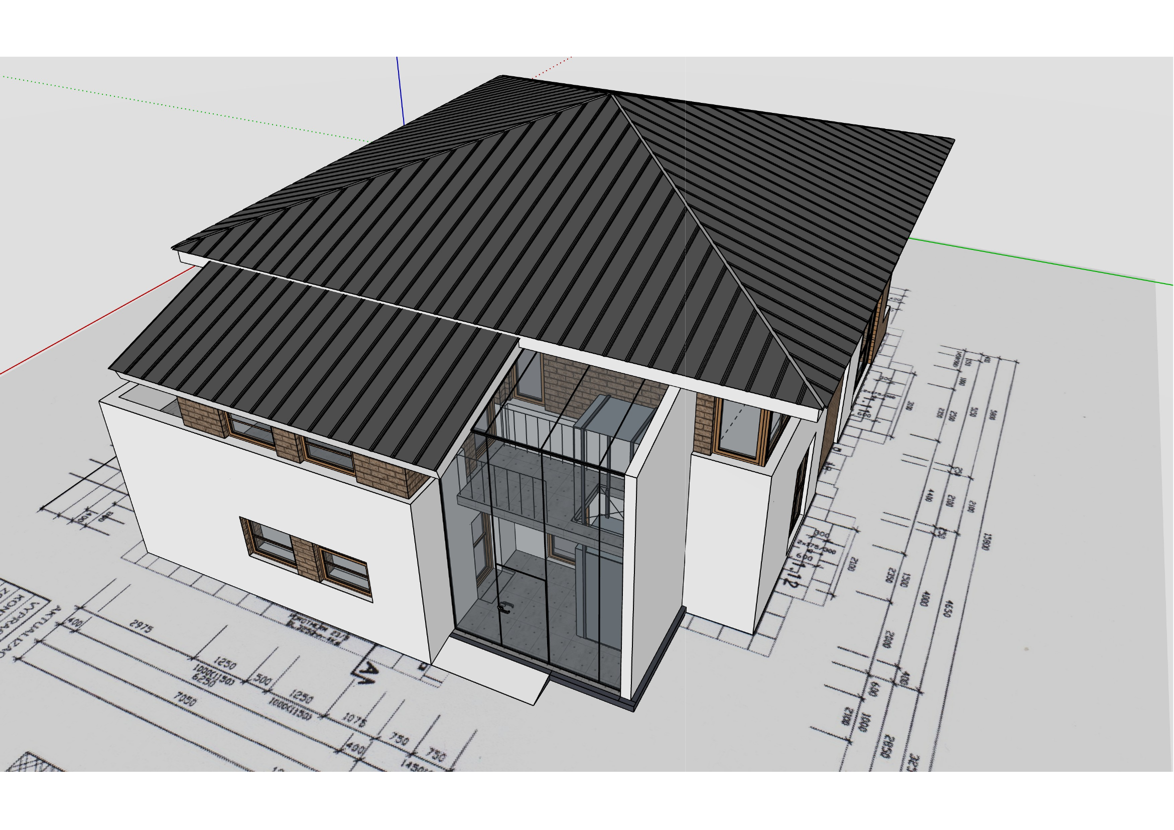 ultra photorealistic architectural visualization based exactly on the provided png reference strict preservation identical camera angle semi aerial view exact perspective and framing preserve full building geometry including roof slopes no redesign no reinterpretation no added elements maintain exact proportions of glass atrium and roof structure architecture description modern two story family house viewed from elevated angle key features dominant pitched roof with multiple slopes dark standing seam metal roofing central glass atrium double height entrance space balcony inside atrium with railing combination of white plaster ground floor and brick clad upper floor clean modern geometry with strong horizontal and diagonal lines roof hlavn dominanta dark anthracite standing seam metal roof sharp precise seam lines satin finish not glossy subtle natural weathering realistic edge detailing and thickness extr mn d le it ai nesm zm nit tvar st echy ani jej sklony glass atrium full height transparent glazing visible interior staircase or entrance hall balcony structure realistic reflections light penetration slight imperfections micro dirt subtle reflections of sky materials pbr high detail white plaster smooth matte finish soft diffuse light very subtle imperfections brick facade warm brown tones natural variation realistic joints and depth wood frames oak tone visible grain satin finish glass physically correct ior realistic reflections transparency metal elements dark aluminum soft reflections lighting late afternoon golden hour cinematic sunlight from upper left direction strong highlights on roof ridges grazing light across metal seams zv razn strukturu soft shadows in atrium global illumination on sky soft blue with warm horizon tones light atmospheric haze environment no replace sketchup base realistic light camera elevated camera approx 3 5 m height slight wide angle 28 35mm natural perspective no distortion subtle depth of field render settings 8k resolution ray tracing on global illumination on ambient occlusion subtle physically based rendering pbr ultra detailed textures post process cinematic but realistic slightly warm tone balanced contrast no hdr overprocessing clean architectural presentation strict geometry lock no interpretation no design enhancement no added objects photorealism priority architectural accuracy enforced