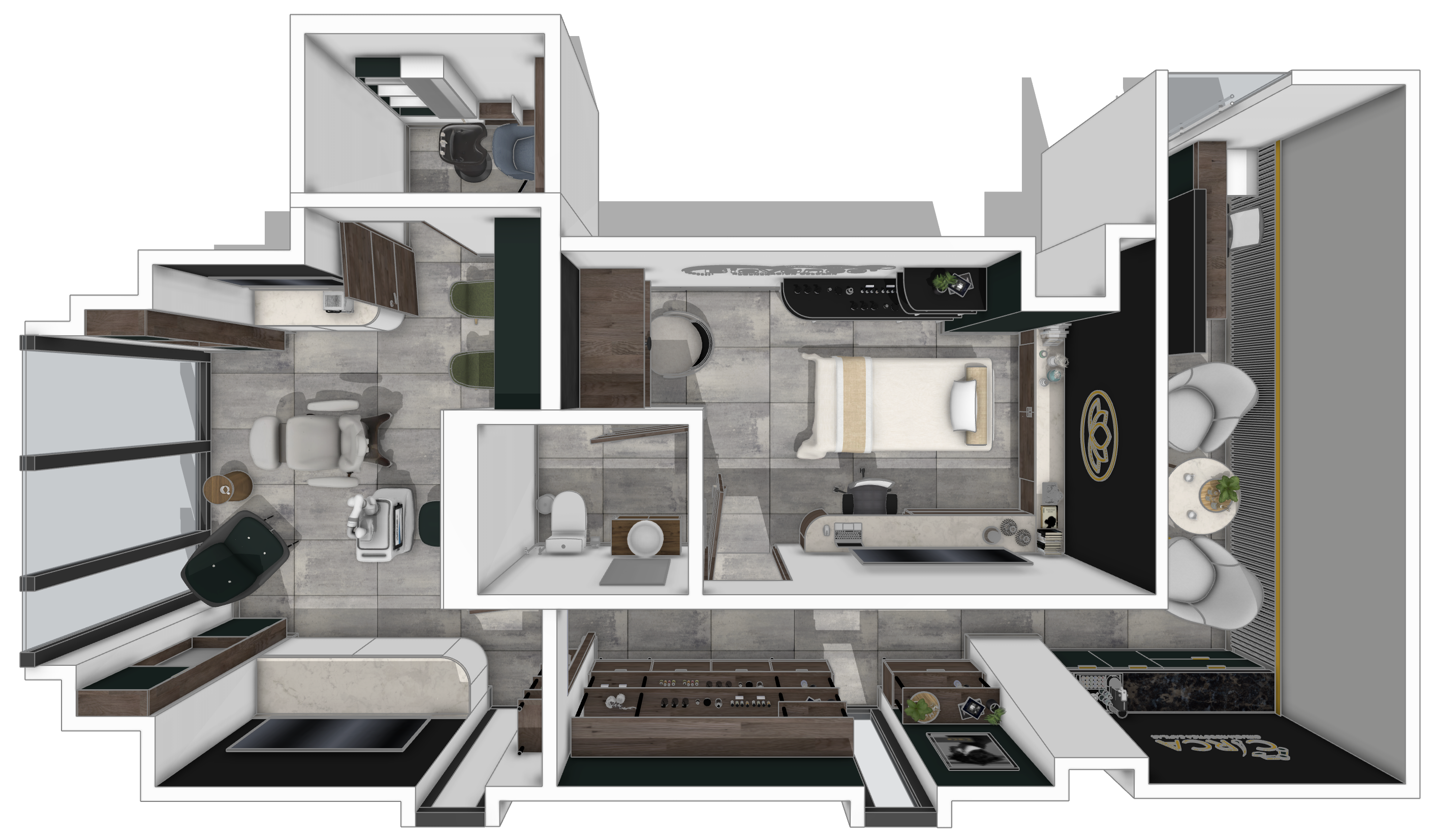 aerial shot generate a beautifully rendered 3d interior layout featuring a top down view of a modern apartment use rich wooden textures for cabinetry and accents complemented by sleek white surfaces for a clean and contemporary look incorporate deep green accents in chairs and wall decorations adding a touch of nature and elegance the flooring should be a polished light gray stone for a sophisticated atmosphere soft ambient lighting enhances the serene and welcoming environment ensure large clear windows for natural light and include subtle pops of gold for luxury the overall atmosphere should be modern elegant and harmonious emphasizing comfort and style architecture