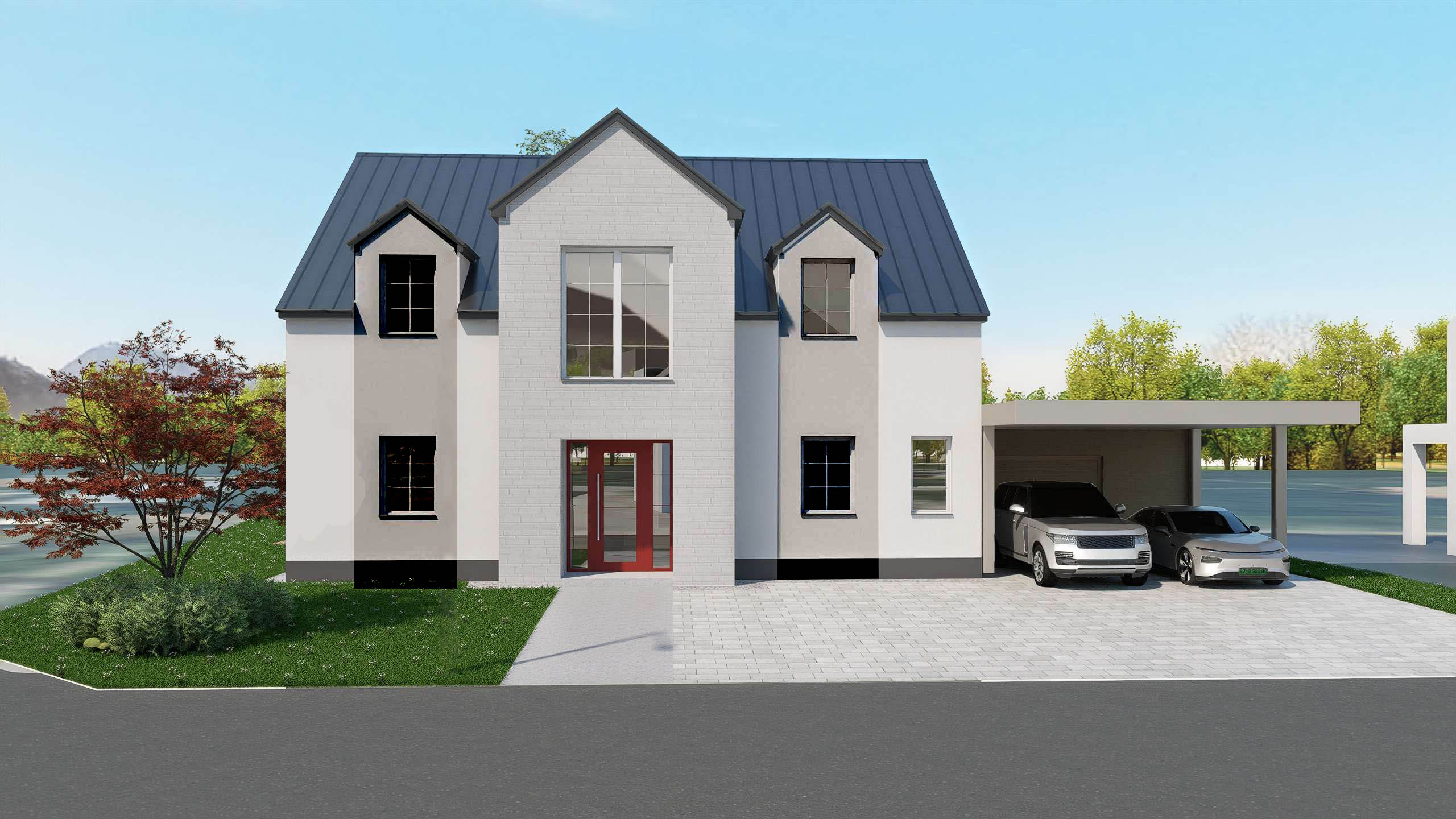 exterior shot dark red roof red front door
