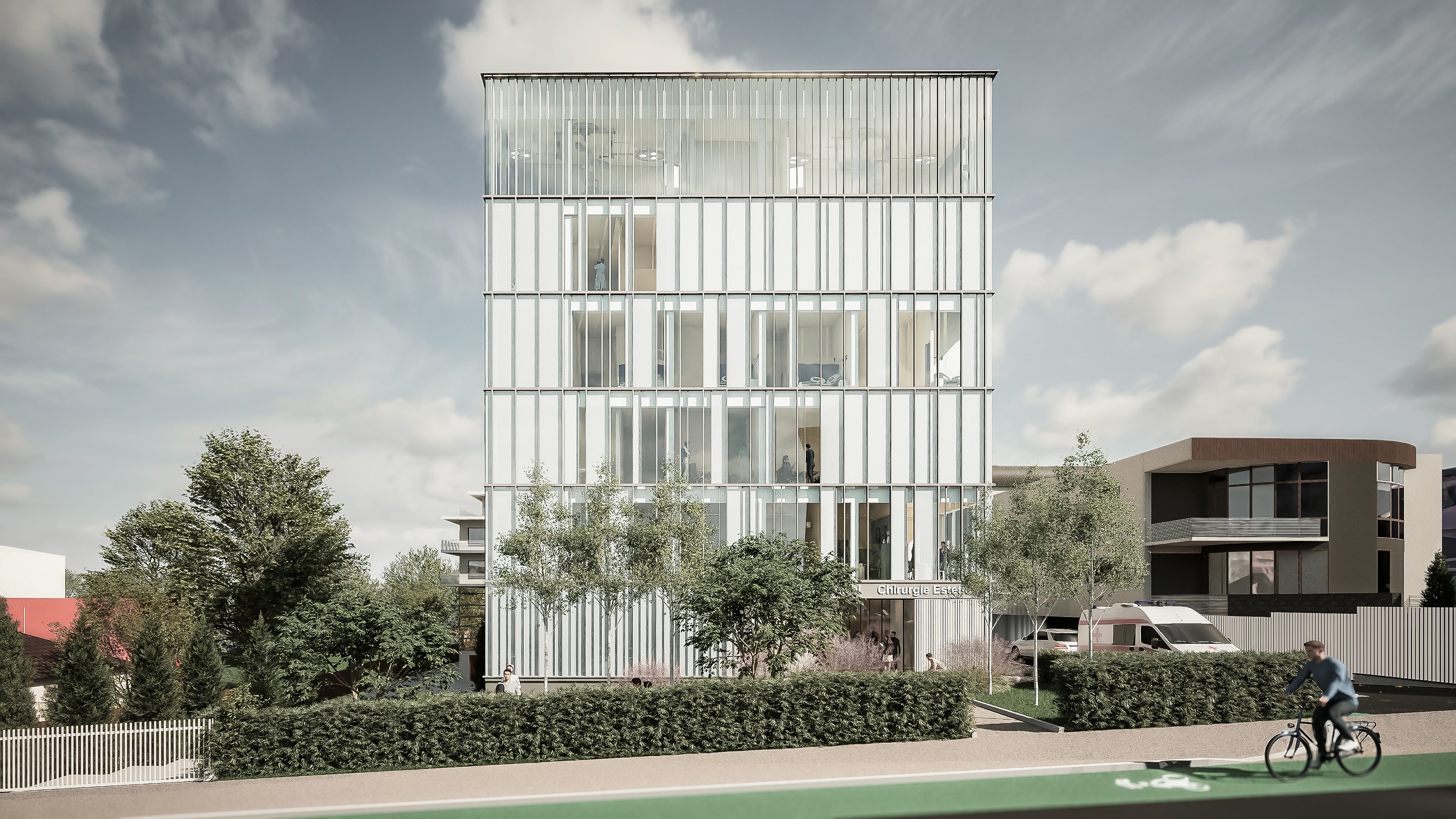 important preserve the existing geometry and the existing context exactly as provided do not modify alter reinterpret add remove scale or reshape any geometry do not change the site surroundings street layout neighboring buildings vegetation or context elements do not modify geometry scale proportions buildings road layout sidewalks or surrounding context in any way soft late afternoon natural daylight warm and diffused sunlight coming from the upper left subtle long shadows realistic global illumination slightly hazy summer atmosphere soft ambient subtle sky reflections in windows slightly reflective glazing with realistic fresnel effect soft motion blur on passing cars for realism light breeze feeling in vegetation natural green tones sunlit tree leaves casting soft dappled shadows photorealistic exterior visualization balanced exposure no harsh highlights no overblown whites slightly warm white balance realistic asphalt reflections with mild roughness physically accurate light behavior high dynamic range but controlled