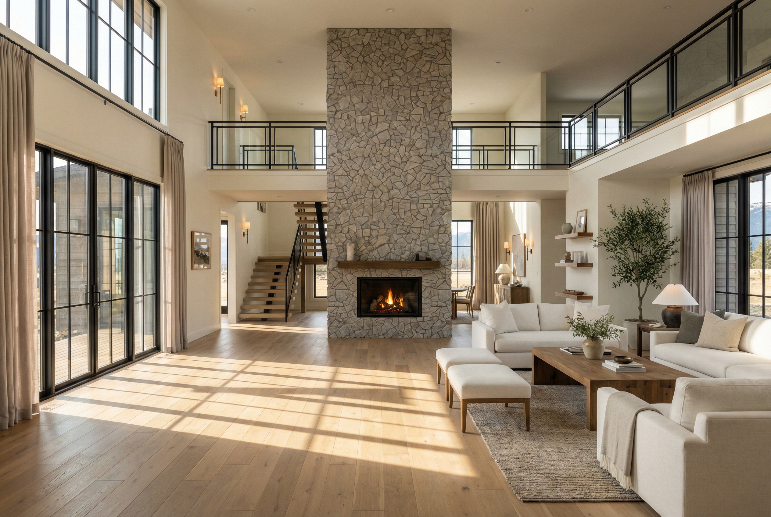 t s important to keep the sizes of everything the same change textures and materials but keep the sizes of everything the same make rock realistic its important to keep to scale this room is big do not change size of windows or doors do not add doors or windows do not change or add fixtures modern warm minimalist interior open living space wide plank white oak flooring soft natural sunlight casting long shadows across floor black steel framed glass partition wall floor to ceiling glass panels with thin mullions neutral color palette creamy white walls light taupe curtains contemporary living room with low profile white sofas warm wood floating shelves with minimal decor plaster fireplace with simple mantle soft ambient lighting large potted indoor tree clean lines high end residential design scandinavian modern aesthetic ultra realistic architectural visualization 8k detail exterior views are western montana