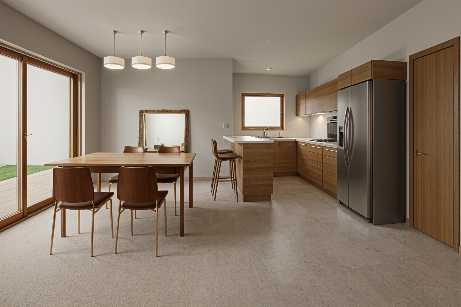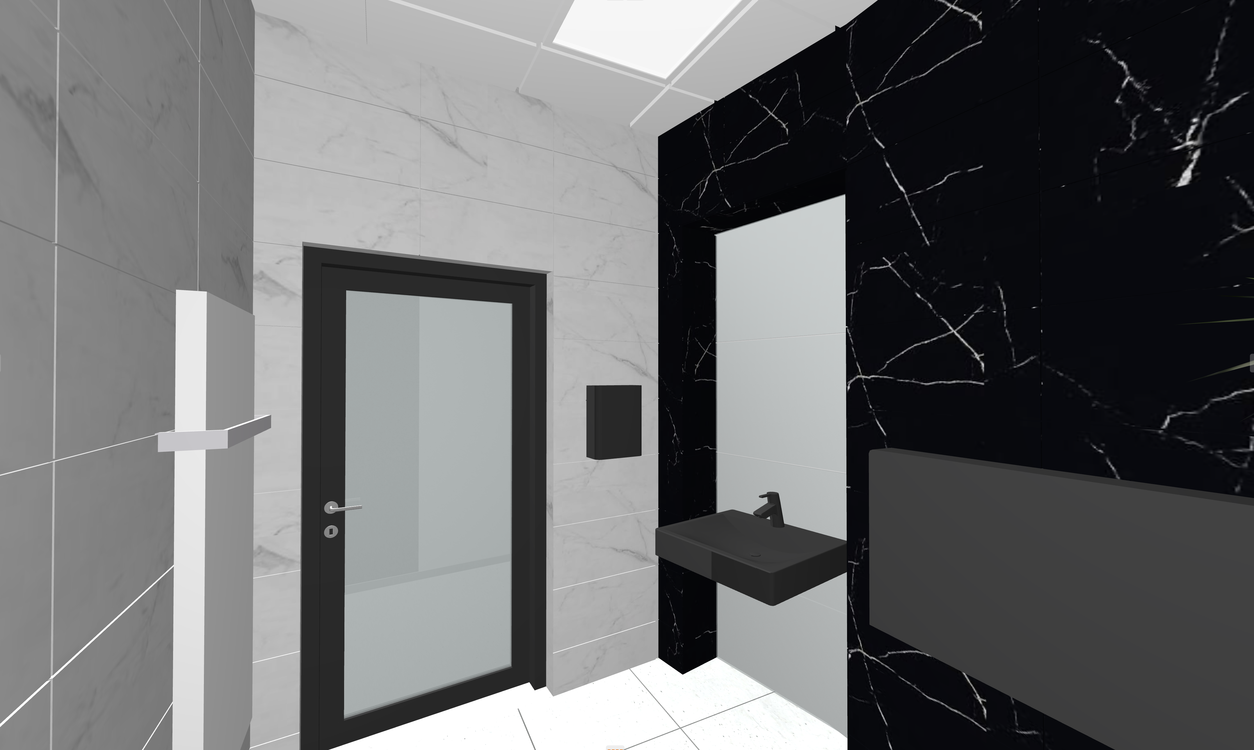 white and black stone on the walls concrete floor lots of light mirror behind the sink and flowerpot bright bathroom