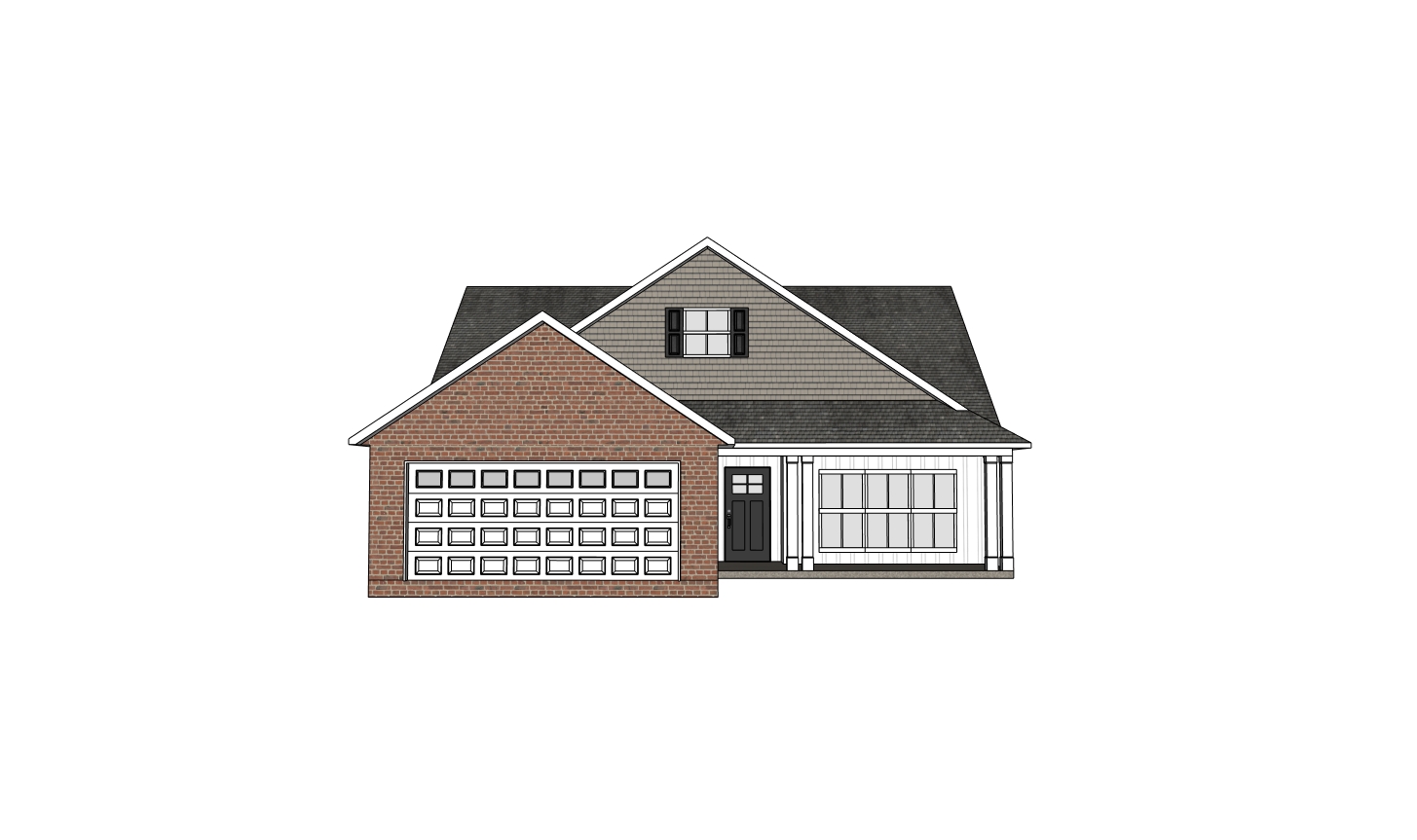house is in a neighborhood concrete driveway on the right with a concrete sidewalk to the front porch garage door has glass on the top row minimal landscaping and a tree in the foreground shake siding in top gable