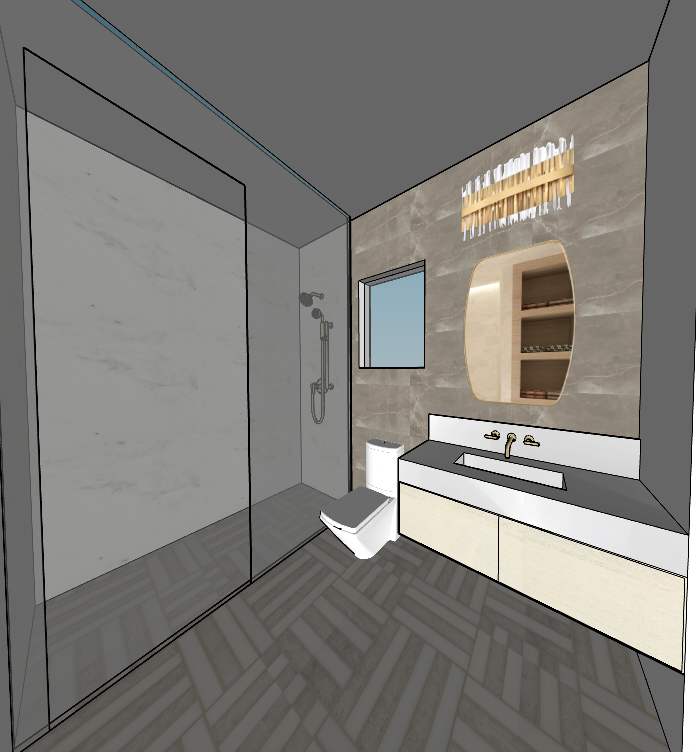 marble walls in the shower and light brown marble on the vanity wall all fixtures are gold countertop is white quartz and the base cabinets are a very light oak