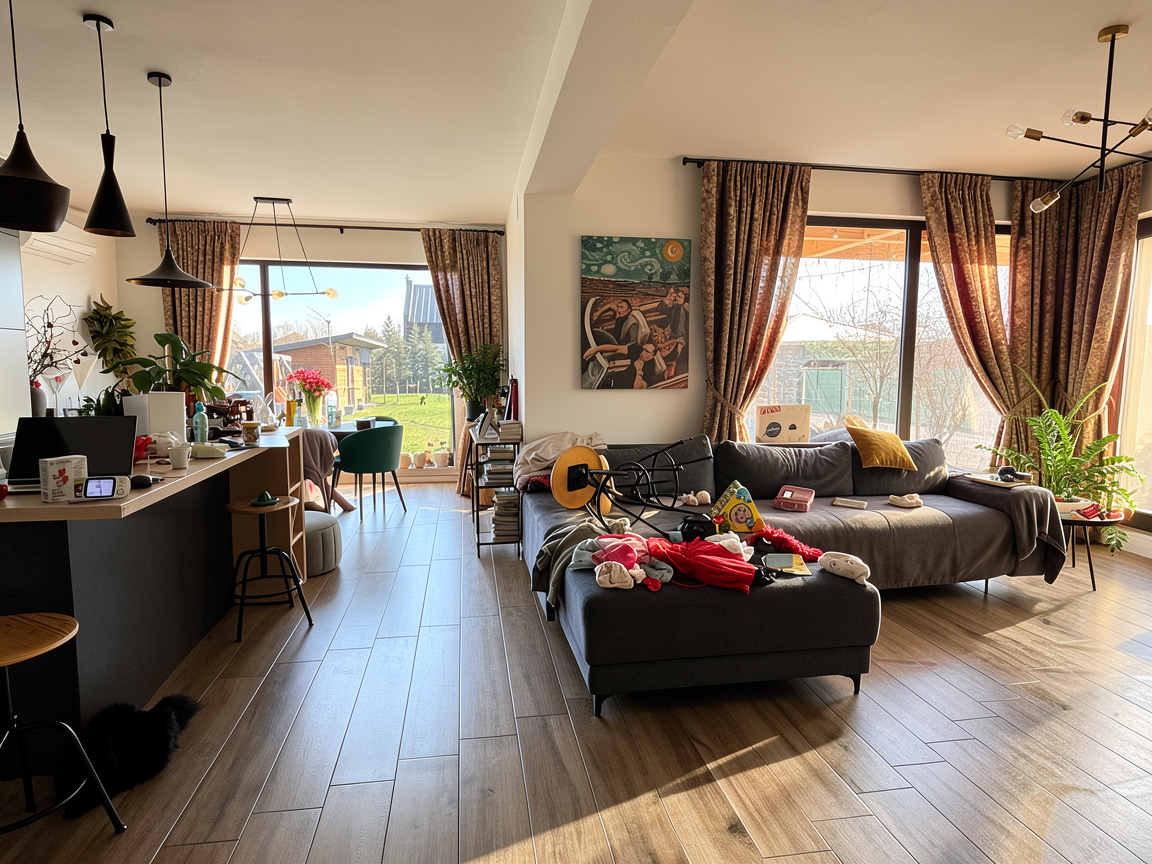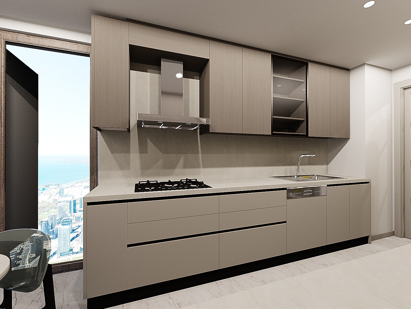 keep the cabinet models the same there should be led lighting inside the glass cabinet there should be led lighting under the upper cabinets the balcony area should be visible from the window