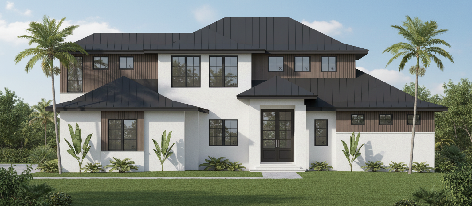 exterior shot make a rendering of this home in a photo realistic style with coastal landscaping