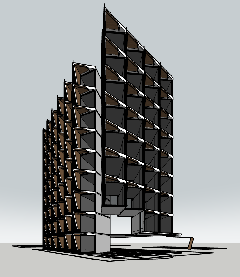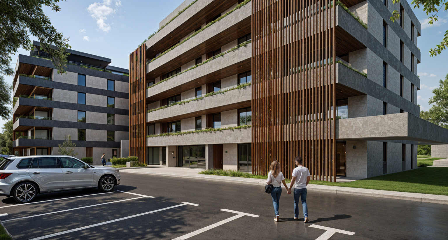 exterior shot exterior shot stunning urban street scene featuring a modern sleek apartment building the building has a minimalist gray facade accented by dark reflective glass windows vertical planters host lush greenery cascading softly from each balcony adjacent a classic brick building adds contrast with warm red and brown tones the street below is bustling with life people casually walking a tree providing fresh greenery and a cafe with beige umbrellas and seating the ground has a neatly paved sidewalk next to a subtle stone wall the atmosphere is vibrant and contemporary filled with bright natural daylight that casts gentle shadows suggesting a peaceful sunny afternoon in the city architecture architecture