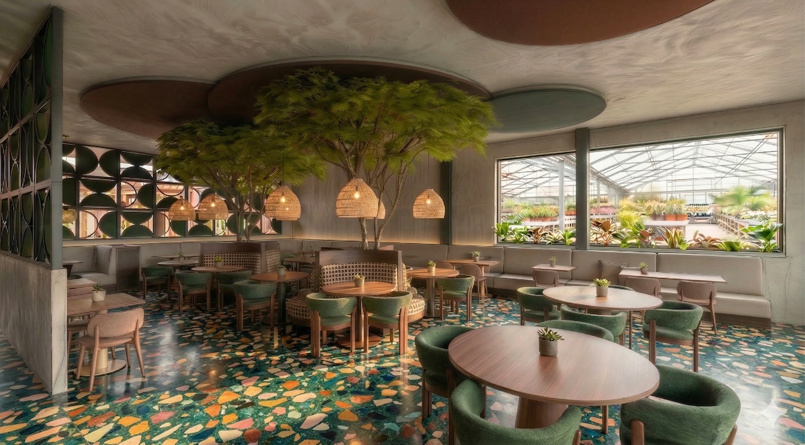replace this terrazzo floor with a lighter terrazzo floor with speckles in terra beige black and green