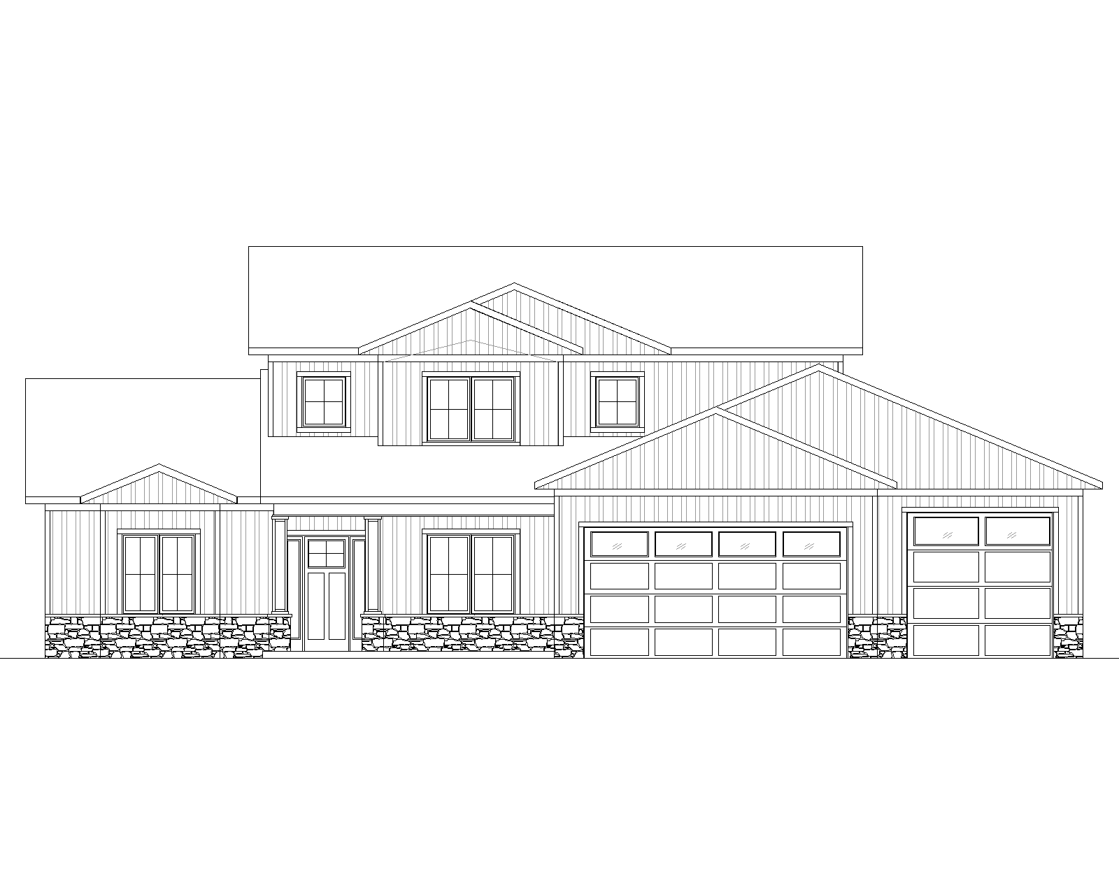 black roof black windows black garage door dark grey siding wood stained columns