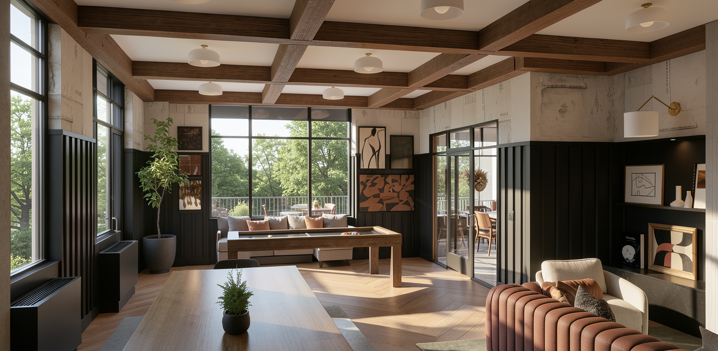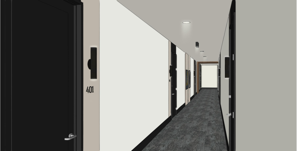 this hallway has no windows or natural light only overhead lighting and wall sconces at the door entries on the 2 tone wall trim