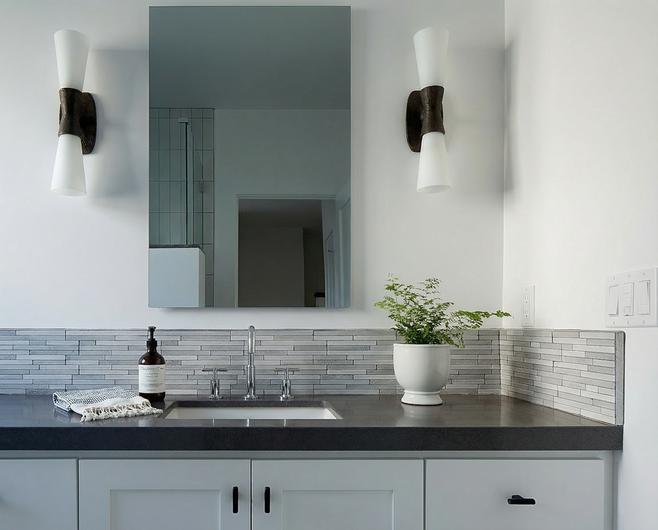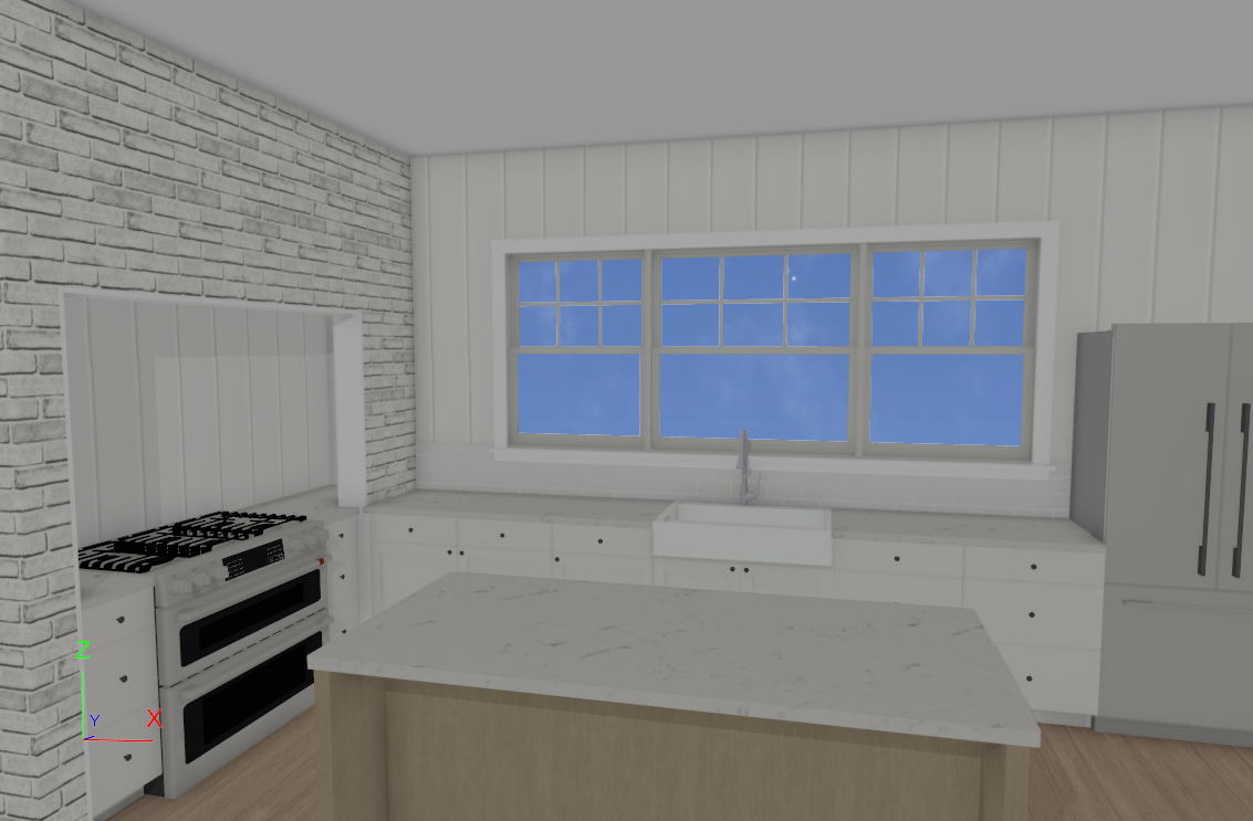 a coastal kitchen with a stormy beach out out the window 2 beautiful rattan pendants over the island 3 white linen chairs at the island white shiplap on the wall with white brick around the stove light warm woods throughout the space chrome faucet