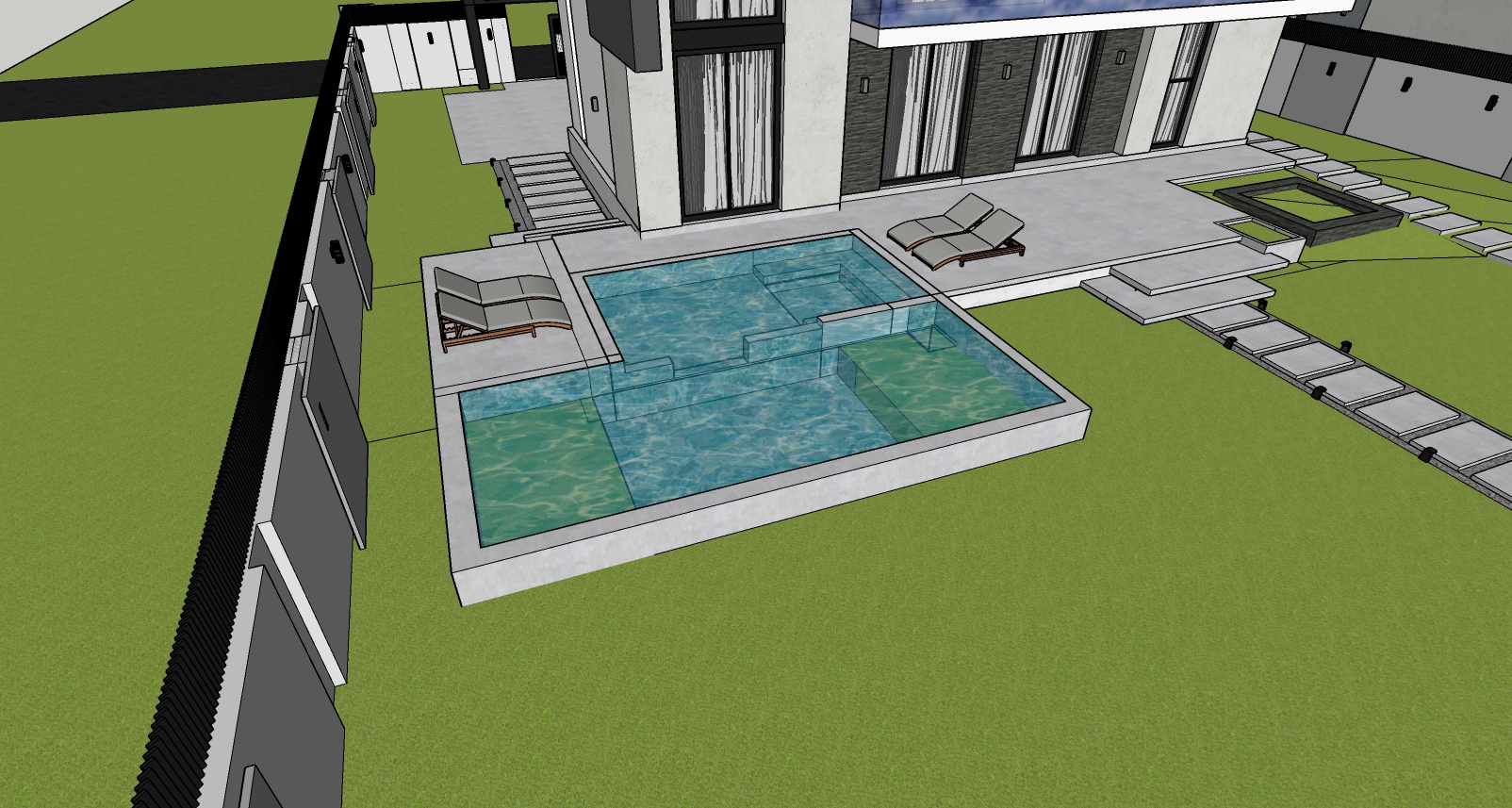photorealistic suburban house exterior classic modern villa style clean white stucco facade warm brick accent around entrance dark gray roof tiles black metal balcony railings golden hour sunlight warm soft shadows global illumination realistic reflections on windows neat front garden landscaping trimmed grass lawn small decorative shrubs clean concrete pathway keep exact geometry keep camera angle do not change windows or volumes no design changes ultra realistic materials architectural visualization dslr photo look sharp focus high detail poll