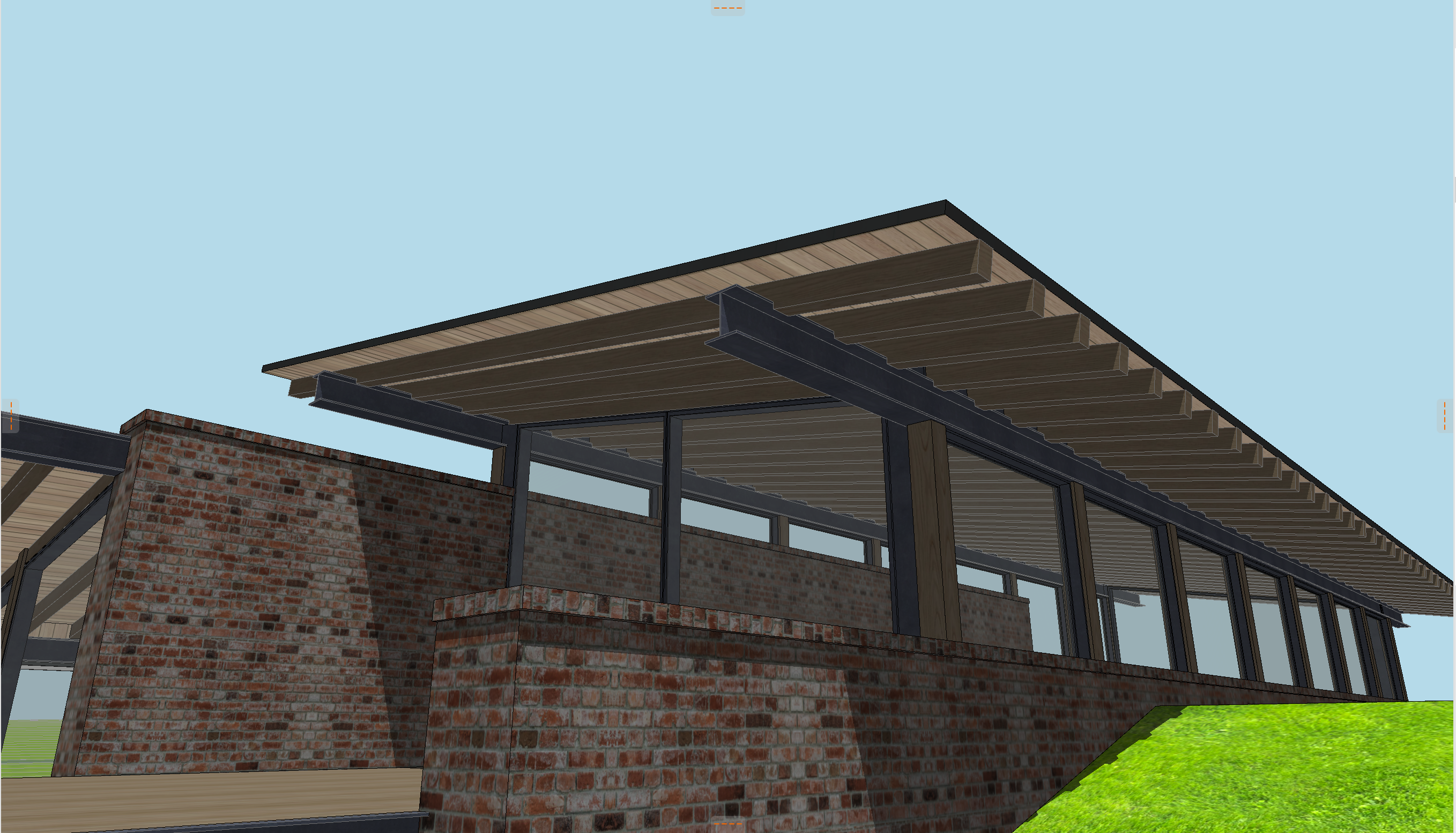 antique brick house with timber columns steel beams glass windows and a standing seam roof wild lousiana grasses add clouds in the sky