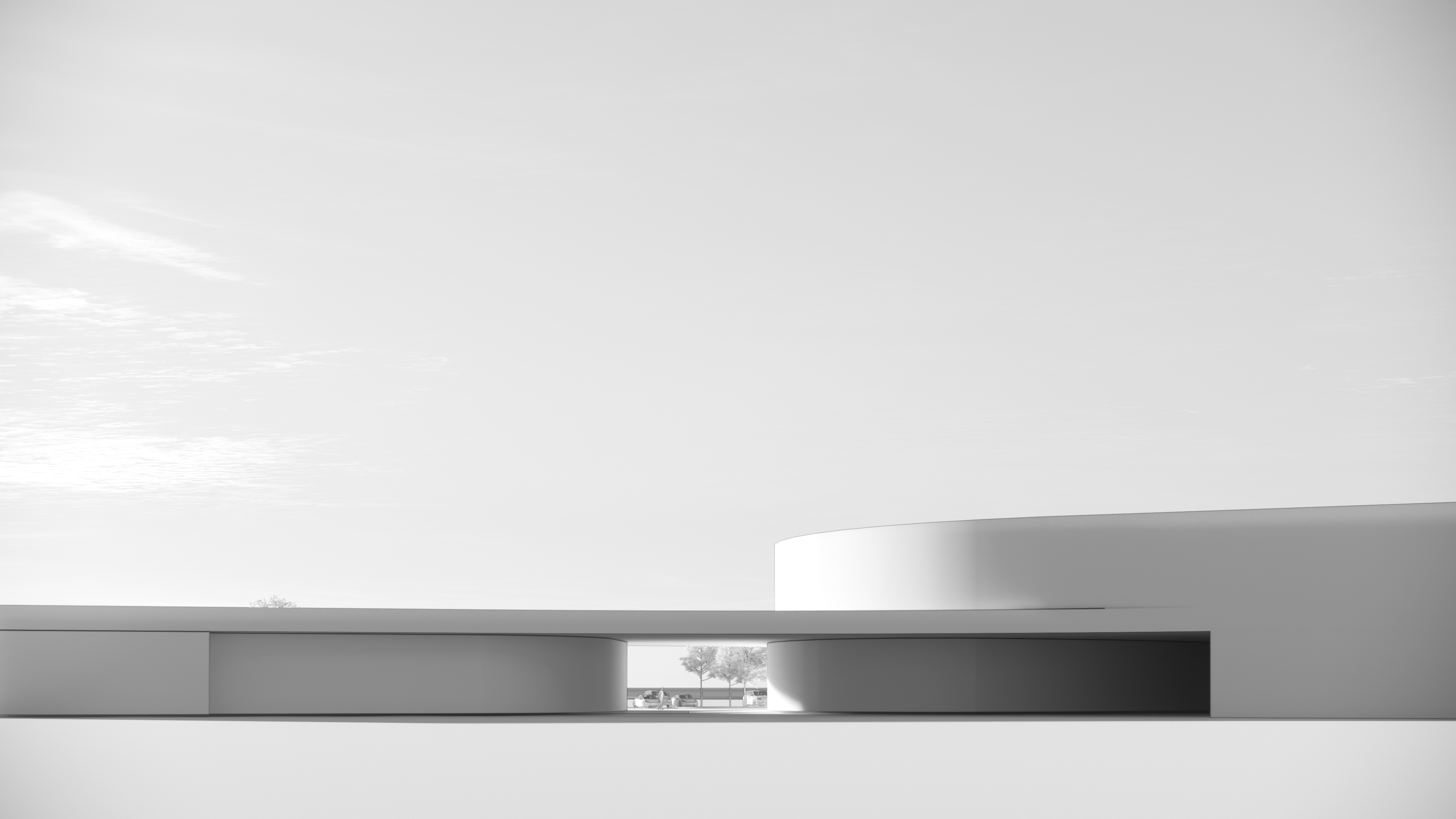 create a serene architectural scene with a modern minimalist building use a soft warm white for the building and add subtle light shadows for depth incorporate a bright clear blue sky with gentle white clouds include verdant greenery like distant trees in various shades of green for a touch of nature the atmosphere should feel peaceful and open evoking a sense of calm and spaciousness