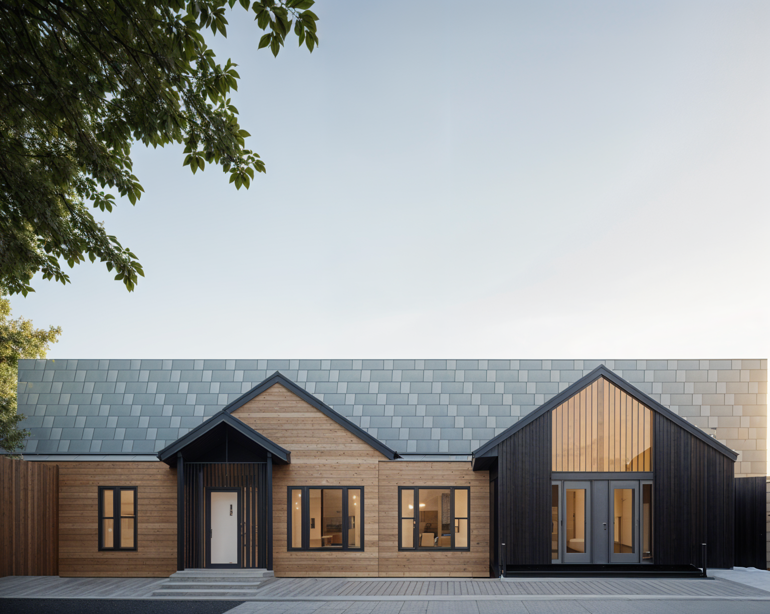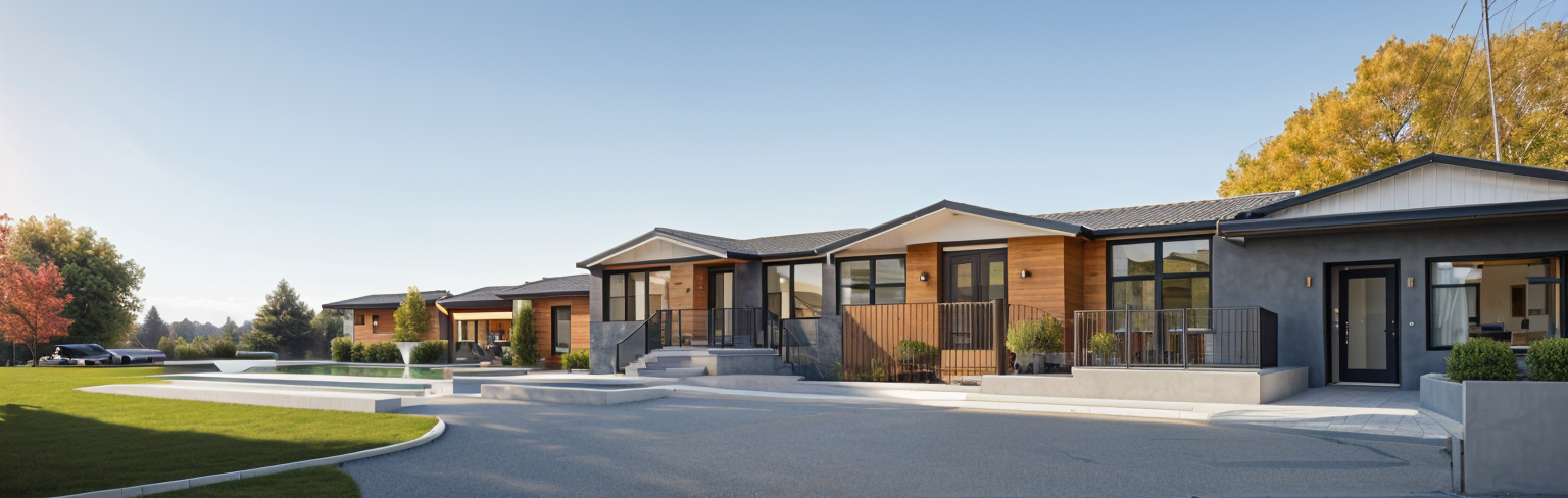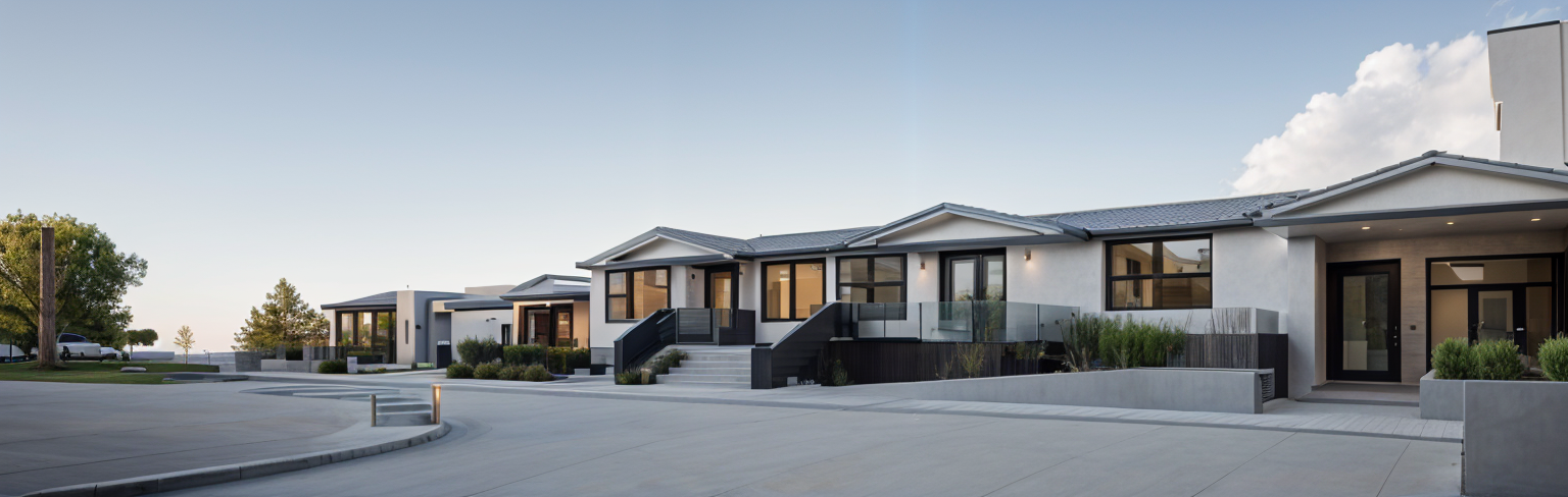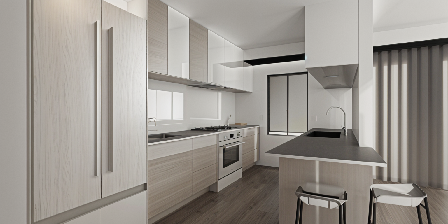 interior shot warm rich walnut wood cabinets matte black countertops mirrored backsplash vague urban scene outside window light honey colored white oak floors for a warm atmosphere walls and ceiling are a soft ivory color under cabinet strip lighting modern clean lines warm and inviting lighting