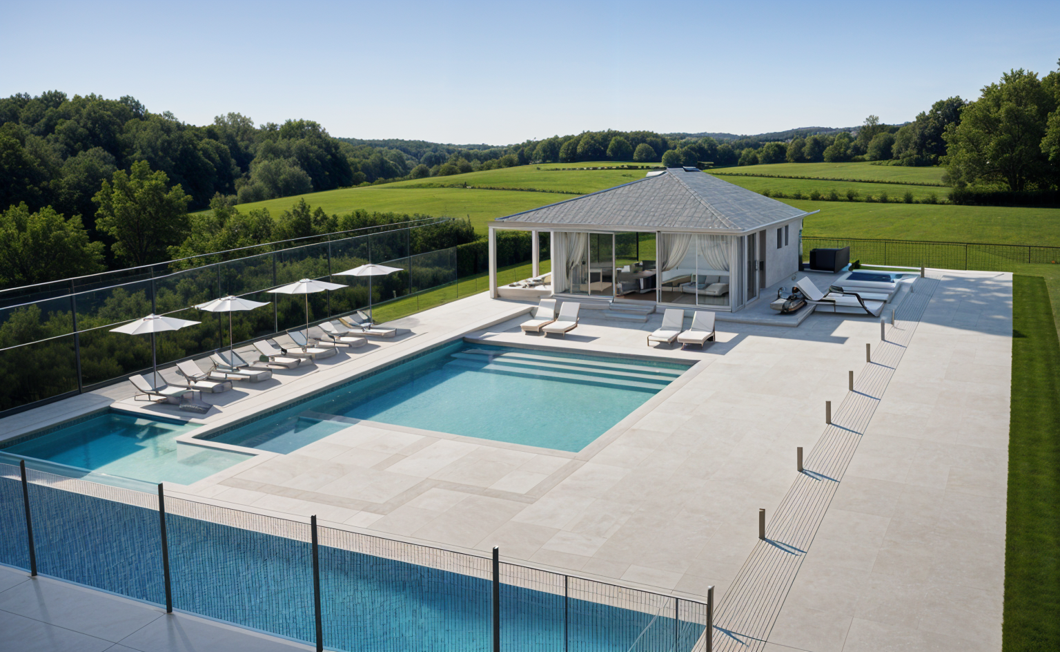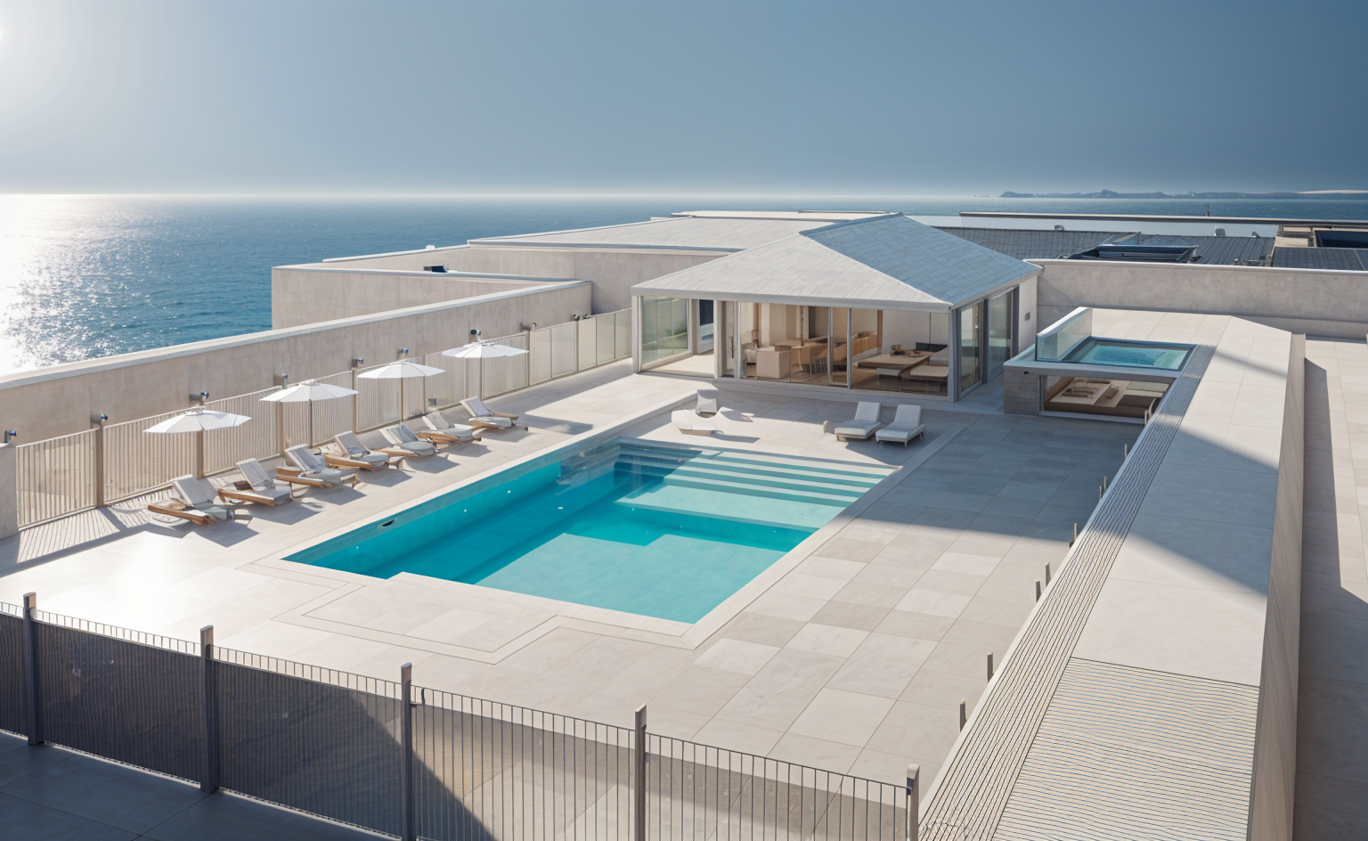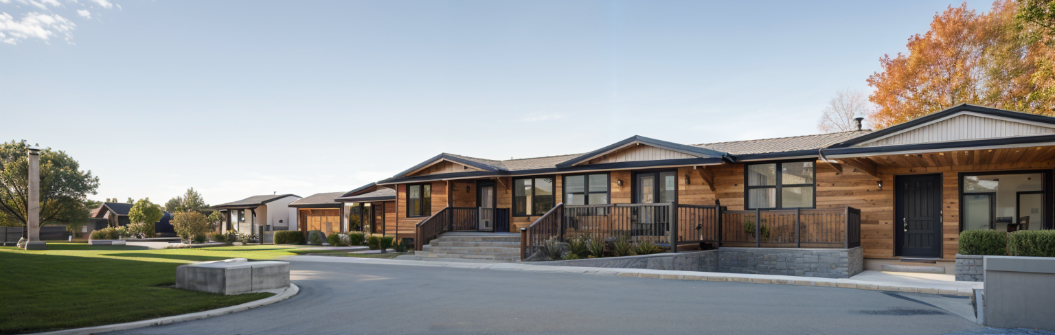 interior shot warm rich walnut wood cabinets matte black countertops mirrored backsplash vague urban scene outside window light honey colored white oak floors for a warm atmosphere walls and ceiling are a soft ivory color under cabinet strip lighting modern clean lines warm and inviting lighting