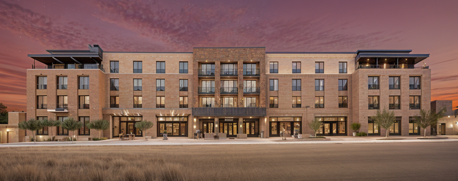 a texas hotel in fort worth combining western and industrial architecture with spanish revival influences stucco and dark brick fa ades arched openings iron balconies decorative towers and a bold central entry canopy a balance of heritage and modern industrial design