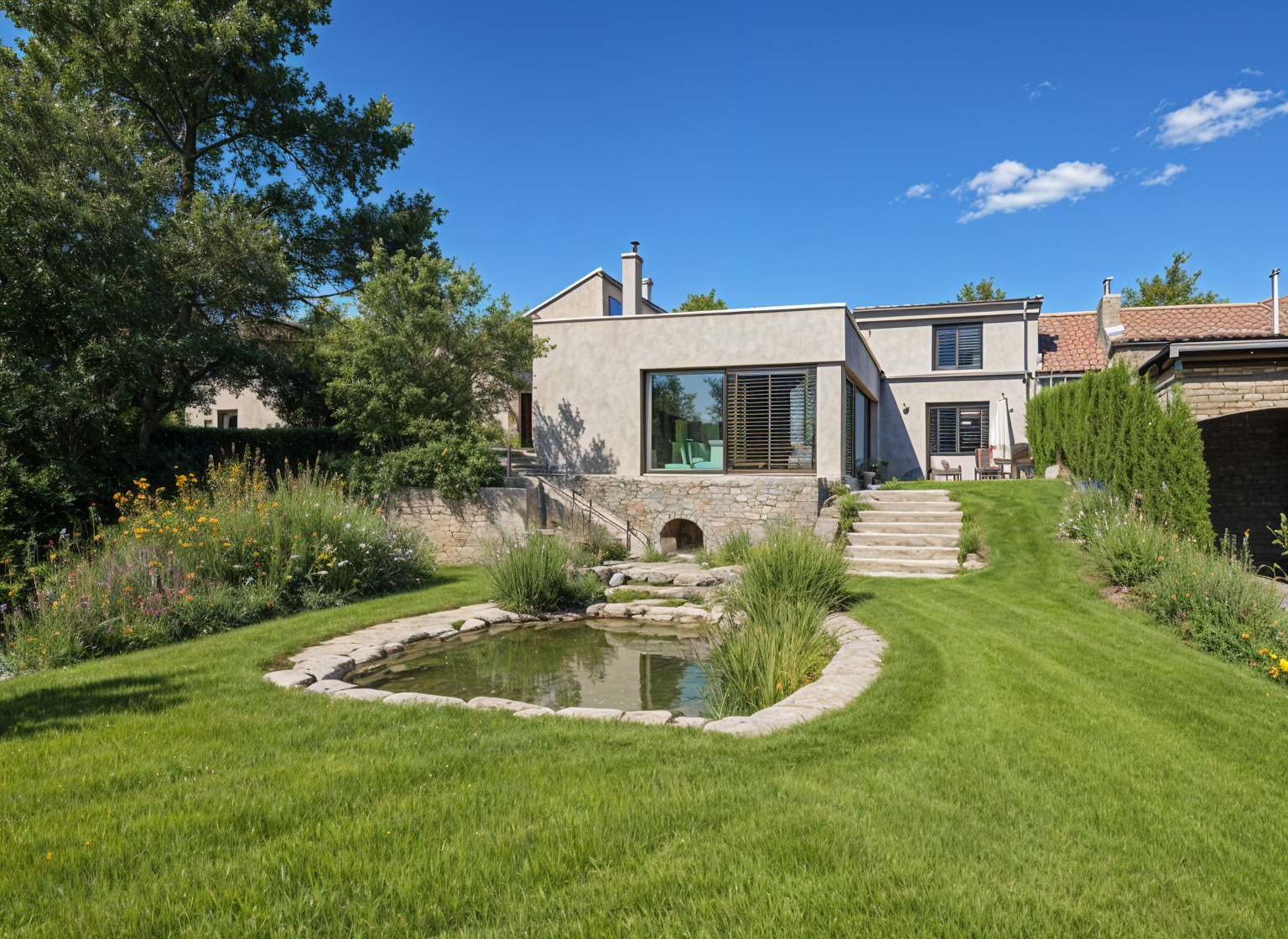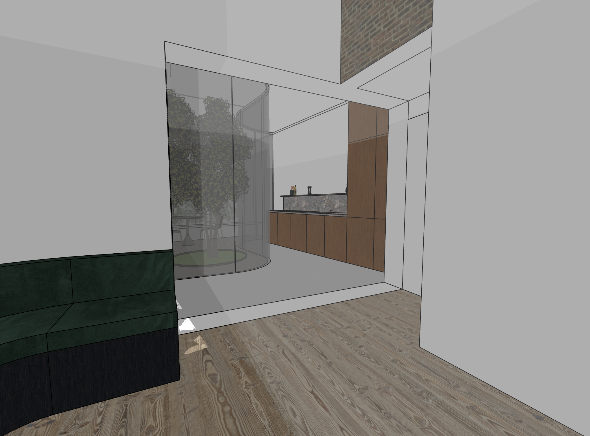 modern interior shot modern interior with minimalistic design featuring a sleek room with neutral grey walls and a stylish dark green velvet couch the floor showcases light oak wood with a natural grain texture highlight a seamless curved glass partition revealing a lush indoor garden with vibrant green foliage the kitchen area displays warm brown walnut cabinetry with a subtle grain pattern contrasted by a speckled stone countertop soft daylight streaming in enhances the tranquil cozy atmosphere architecture