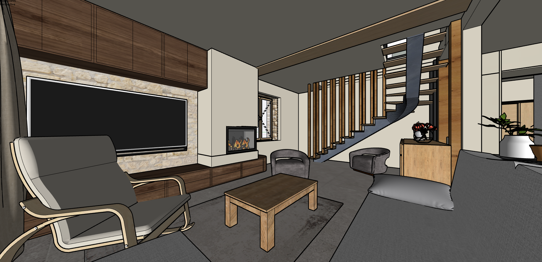 transform this sketchup model into a photorealistic architectural render keep the exact geometry proportions and layout and colors of the model materials realistic textures with natural imperfections wood grain stone texture matte paint lighting soft natural daylight coming from windows global illumination realistic shadows style high end contemporary interior design elegant and warm atmosphere add subtle details realistic reflections natural light bounce depth of field slight ambient occlusion camera architectural photography style wide angle 24mm eye level perspective render quality ultra realistic high resolution physically accurate lighting professional architectural visualization