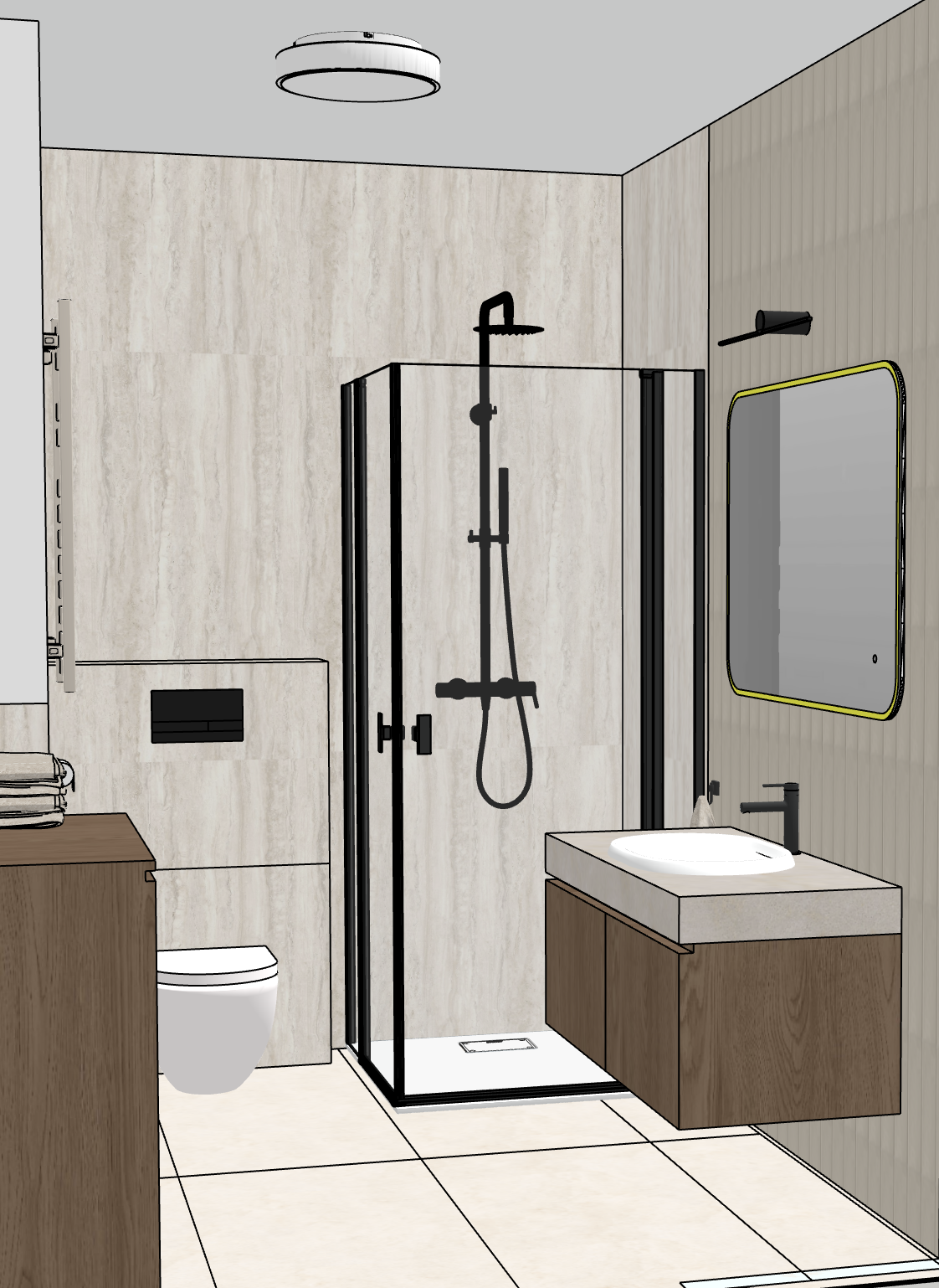 bathroom with led mirror and small tiles behind the mirror travertine tiles on the wall